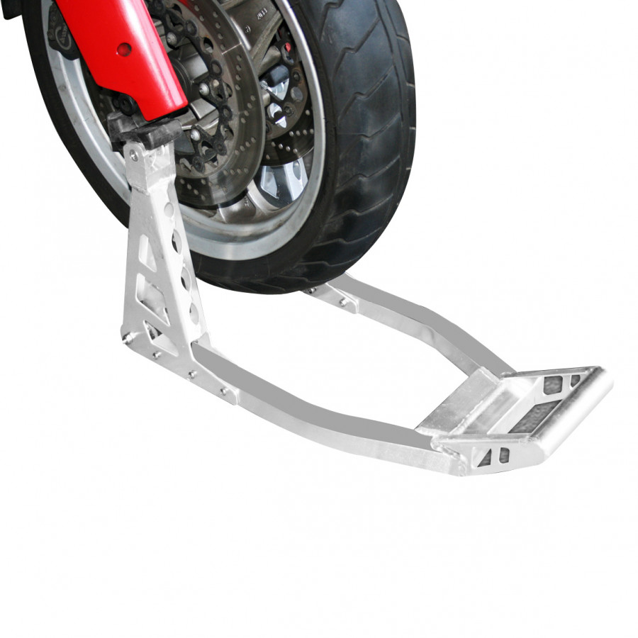 Este caballete de aluminio para motocicleta de Pro Plus es un producto muy popular. Se fija al neumático delantero para estacionar. Su capacidad máxima de carga es de 200 kg. Es compatible con neumáticos de 10,5 a 14 pulgadas.