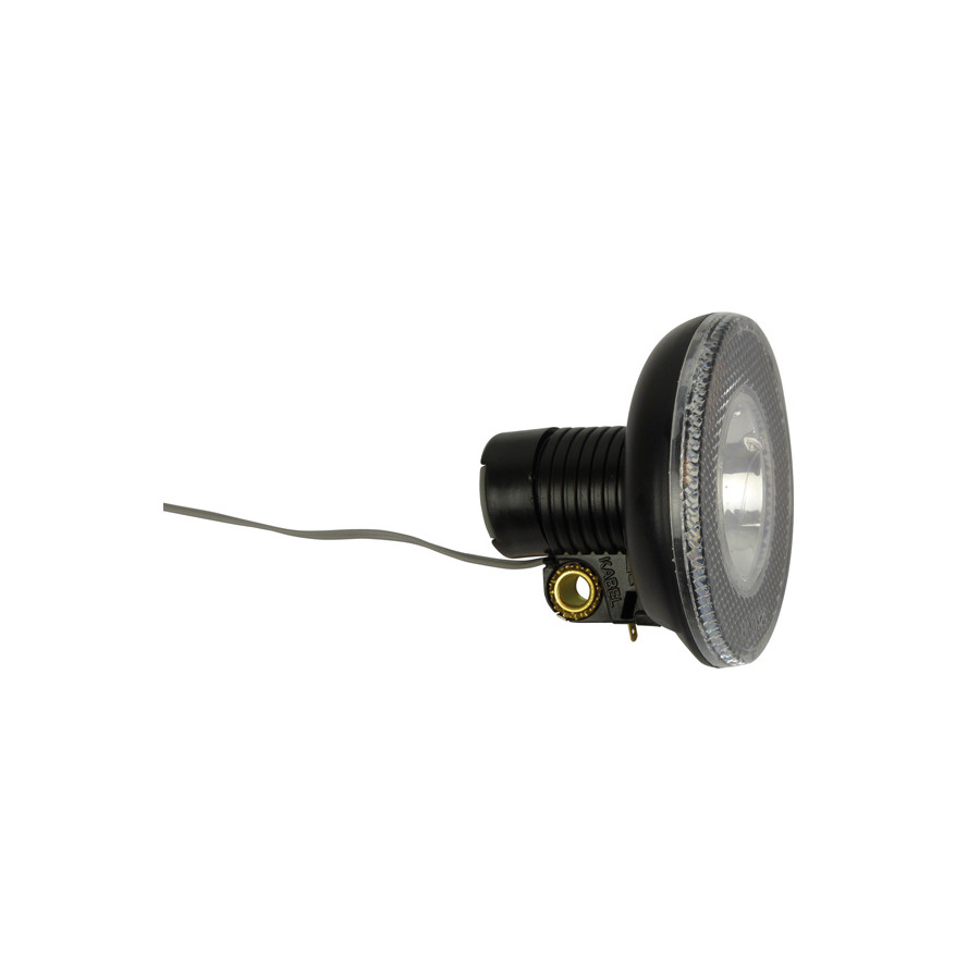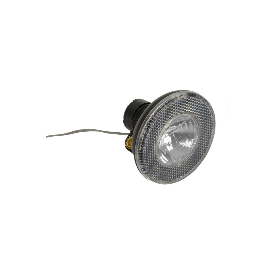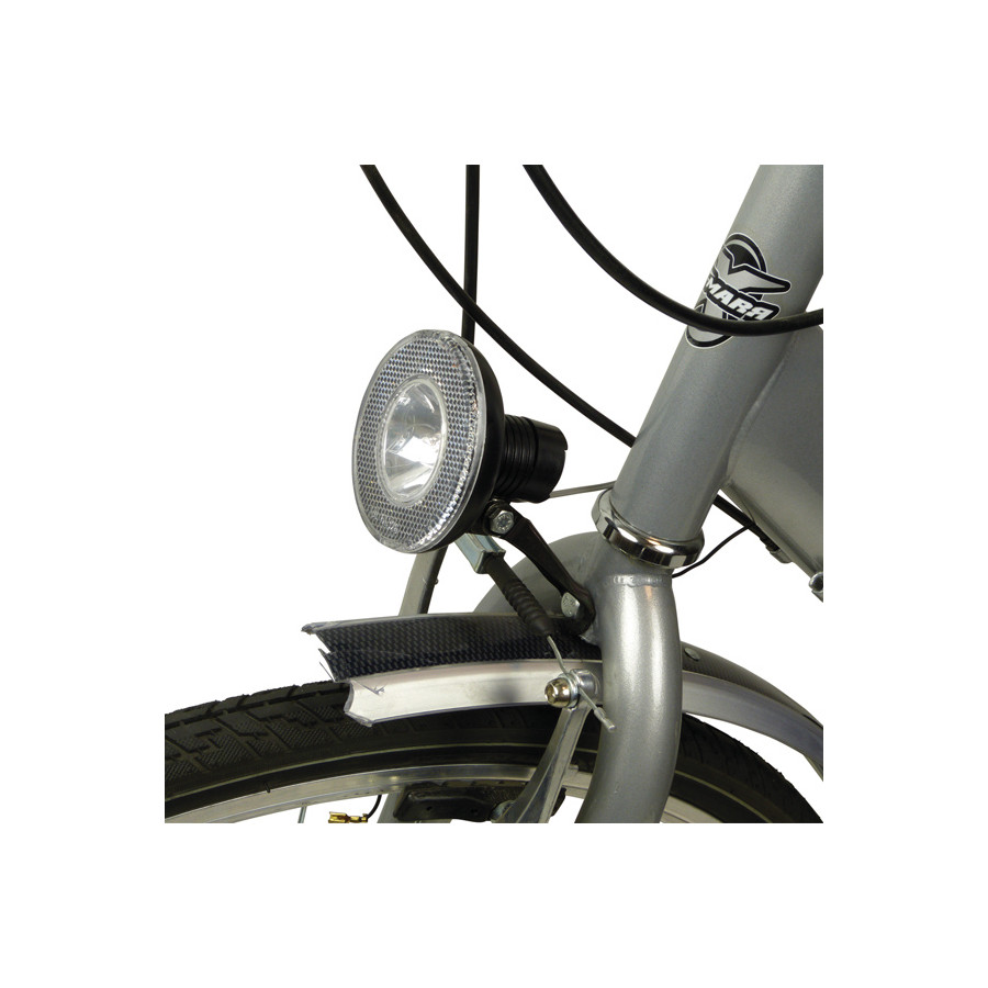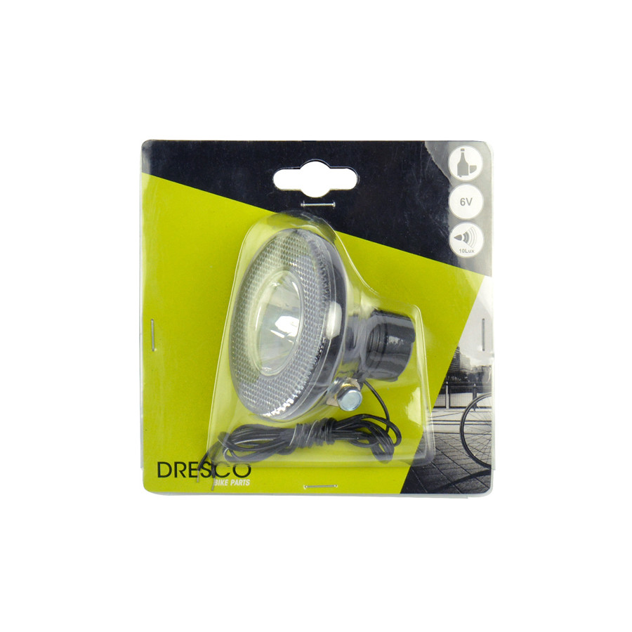 Una buena iluminación para la bicicleta es esencial para el ciclismo, tanto para ver como para ser visto. Este faro Dresco tiene una potencia lumínica de 10 lux y un reflector integrado. La luz de 6 voltios se conecta a la dinamo mediante el cable de iluminación incluido y preinstalado. La luz se puede montar mediante el sistema de tuerca y tornillo en el soporte de luz existente en la horquilla delantera o la dirección.