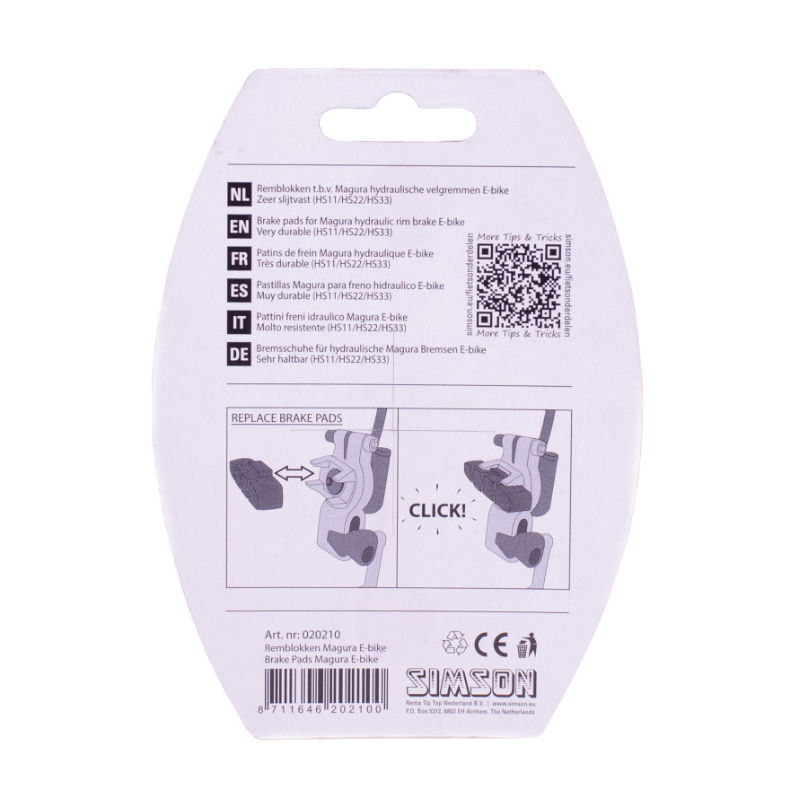 Las pastillas de freno Simson para frenos hidráulicos de llanta Magura están especialmente diseñadas para bicicletas eléctricas. Incluso a altas velocidades y con el mayor peso de una bicicleta eléctrica, la pastilla mantiene un excelente rendimiento. El compuesto de caucho extraduro prolonga su vida útil. Las pastillas de freno Simson son compatibles con el sistema de frenos HS33/HS11. Simplemente extraiga las pastillas usadas del soporte y vuelva a colocar las nuevas. Son compatibles con frenos delanteros y traseros. Las pastillas de freno Simson para bicicletas eléctricas Magura se suministran en paquetes de dos.
