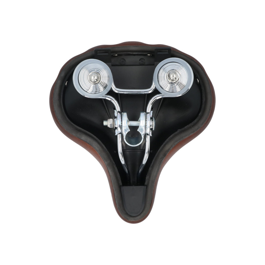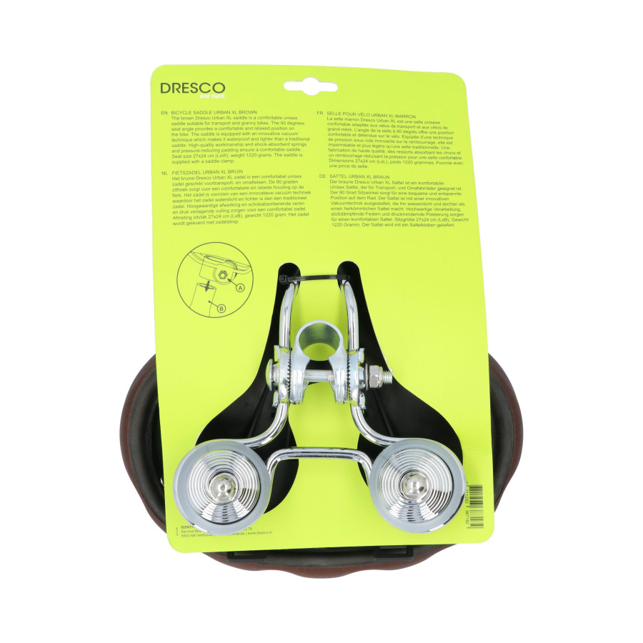 El sillín Dresco Urban XL marrón es un cómodo sillín unisex, ideal para bicicletas de transporte y bicicletas de abuela. Su ángulo de 90 grados garantiza una postura cómoda y relajada sobre la bicicleta. Incorpora una innovadora tecnología de vacío, lo que lo hace impermeable y más ligero que un sillín tradicional. Su fabricación de alta calidad, sus muelles amortiguadores y su acolchado que alivia la presión garantizan un sillín cómodo. Dimensiones del sillín: 27 x 24 cm (largo x ancho); peso: 1220 gramos. Incluye abrazadera.