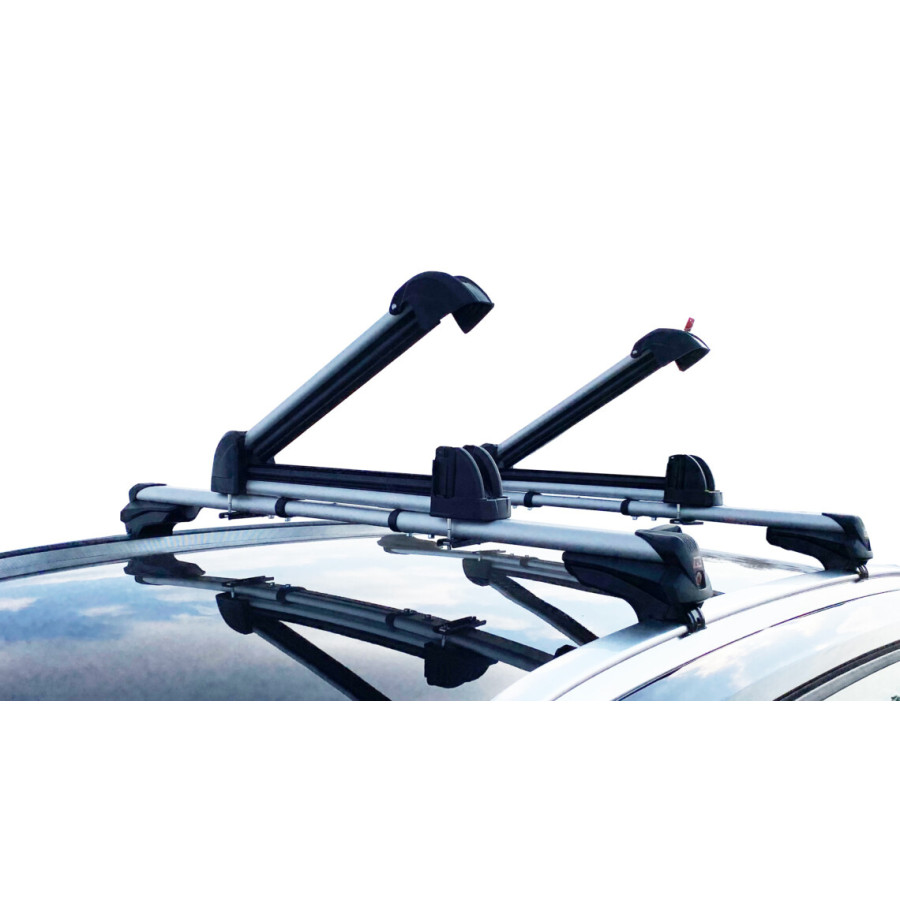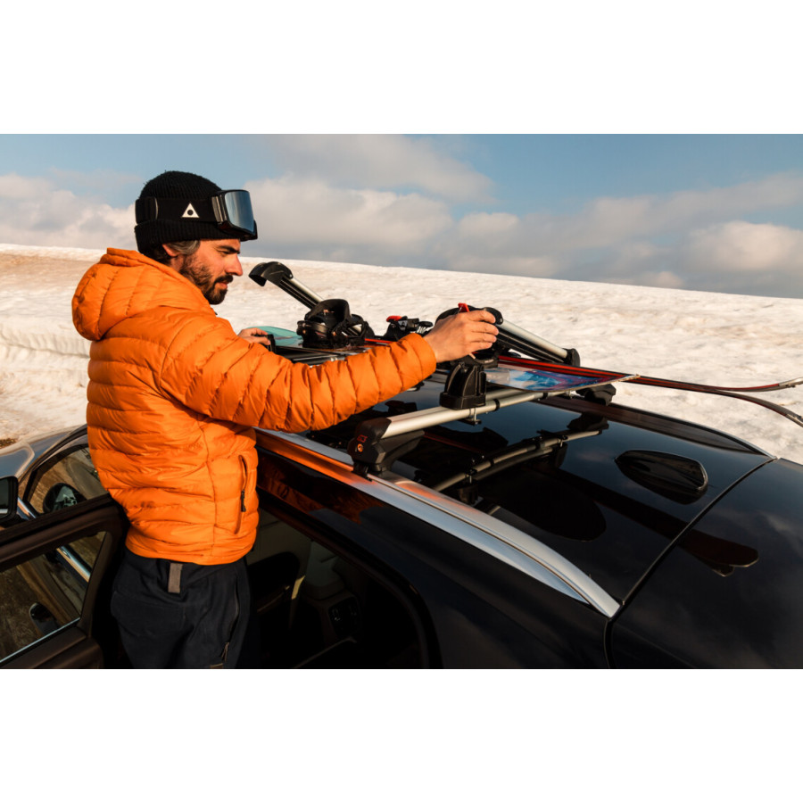 Los portaesquís G3 Summit 4 permiten transportar fácilmente dos tablas de snowboard o cuatro esquís. La abrazadera de goma mantiene todo firmemente en su lugar, evitando daños en los esquís o tablas. Como la abrazadera está montada más arriba que las bacas, hay espacio de sobra para las fijaciones.