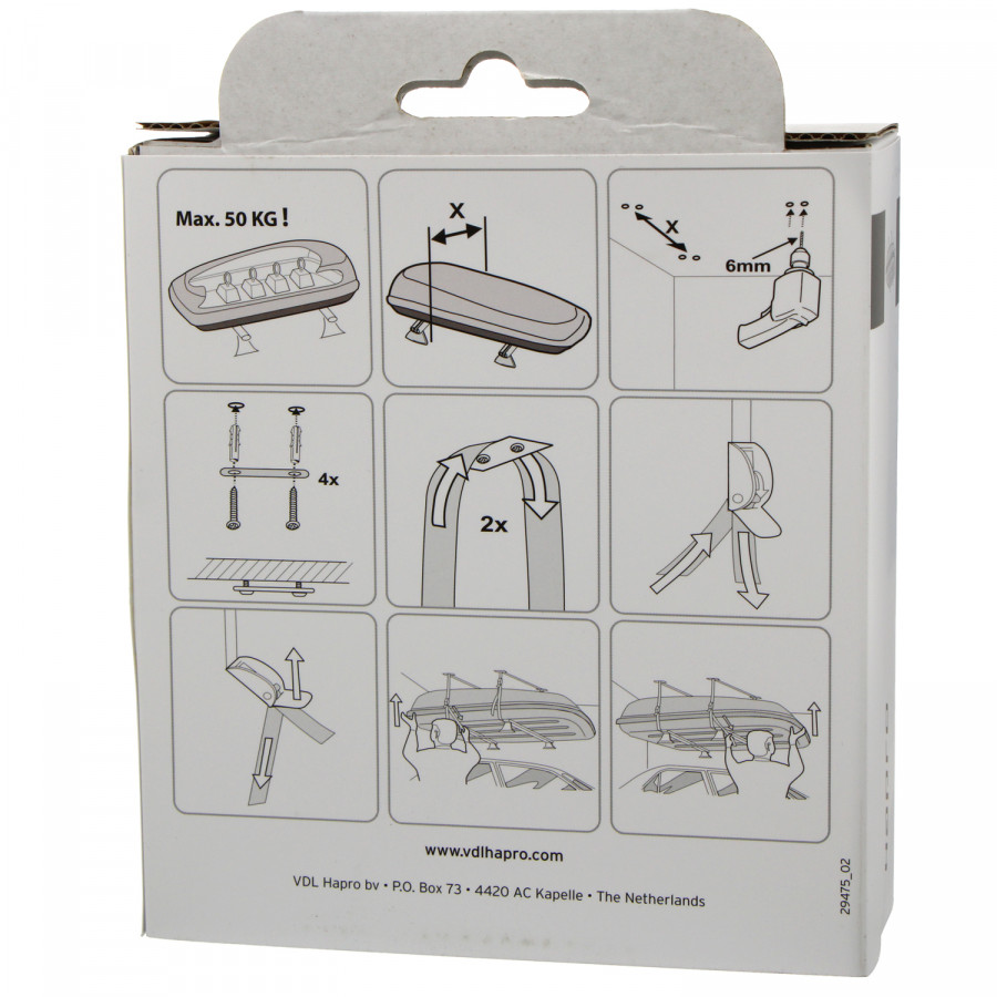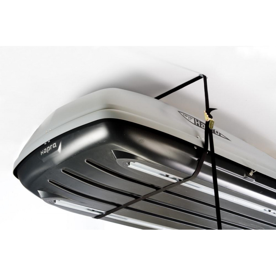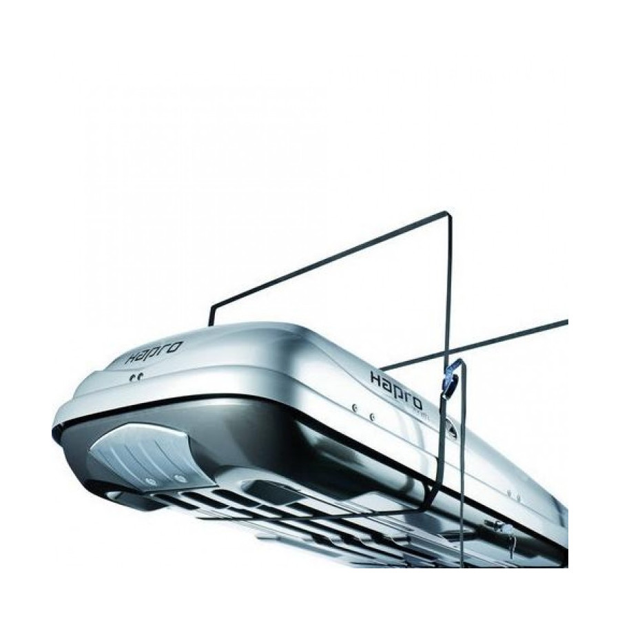 El Hapro Box Lift te ayuda a guardar tu cofre de techo. Este sistema de suspensión para techo te permite guardar tu cofre de techo con el mínimo esfuerzo. Fija el Box Lift al techo y, mediante un sistema de elevación con correas de tensión, puedes guardar fácilmente tu cofre de techo en lo alto. Este sistema no solo te permite guardar fácilmente tu cofre de techo, sino que también simplifica su montaje y desmontaje. Si fijas este sistema de suspensión al techo de tu garaje o cochera, puedes levantar el cofre de techo directamente desde tu coche y guardarlo. Incluso es posible levantar el cofre de techo, incluyendo las bacas, del coche. Si quieres fijar correctamente el cofre de techo a tu coche, puedes colocarlo debajo del Box Lift y bajar el cofre de techo para colocarlo sobre el techo. El Hapro Box Lift es un sistema de suspensión que garantiza que tu cofre de techo siempre se pueda mover, desmontar y guardar fácilmente.
