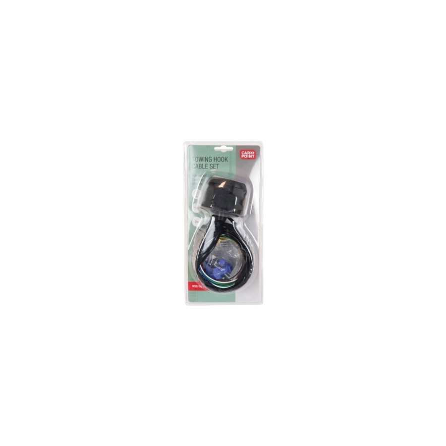 Kit de cableado para enganche de remolque Carpoint con toma de 7 pines e interruptor de luces antiniebla. El cable incluido tiene 2 m de longitud. El kit es fácil de instalar gracias al manual incluido.