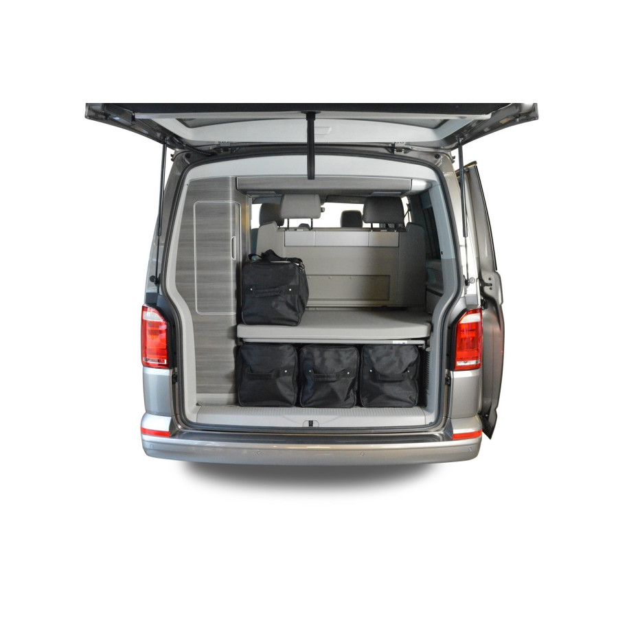 Estas bolsas de viaje Car-Bags están hechas a medida para maximizar el espacio de equipaje en tu autocaravana California. Puedes pedirlas individualmente; caben un máximo de seis en la California. Se pueden colocar en el coche de dos maneras (ver fotos):