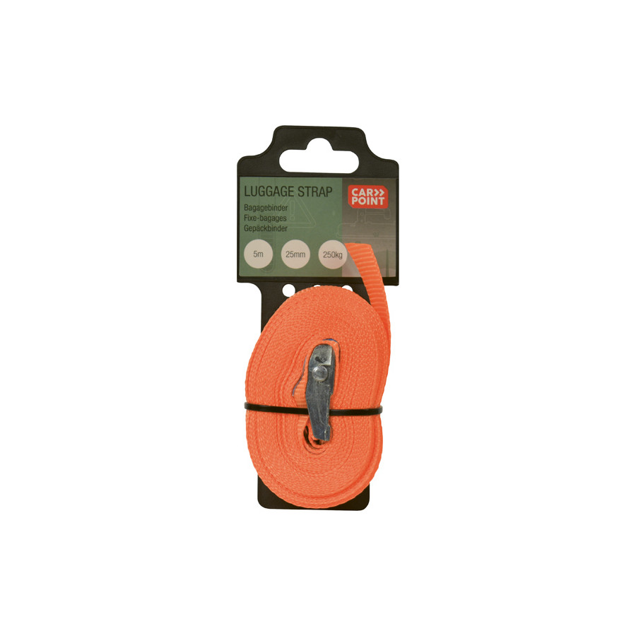 La correa de amarre Carpoint sujeta firmemente cargas pesadas, impidiendo que se desplacen. La correa para equipaje puede usarse para asegurar la carga en un remolque, pero también es adecuada para evitar que se abra el maletero. La correa de amarre Carpoint tiene 25 mm de ancho y 5 metros de largo.