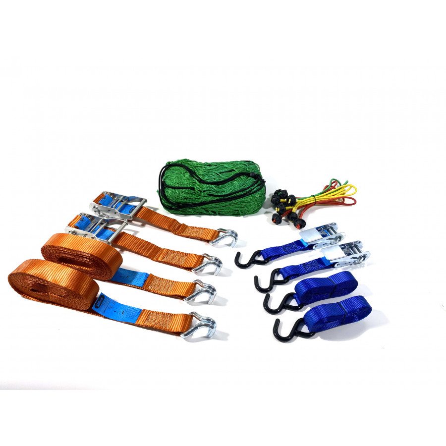 | Contenido | 2 x Correas de tensión con ganchos en S 600KG 500cm - 25mm | 2 correas de tensión con ganchos en forma de S 2000KG 600cm - 38mm | 1x Net 200cm x 300cm | 10 bolas elásticas de 20 cm |