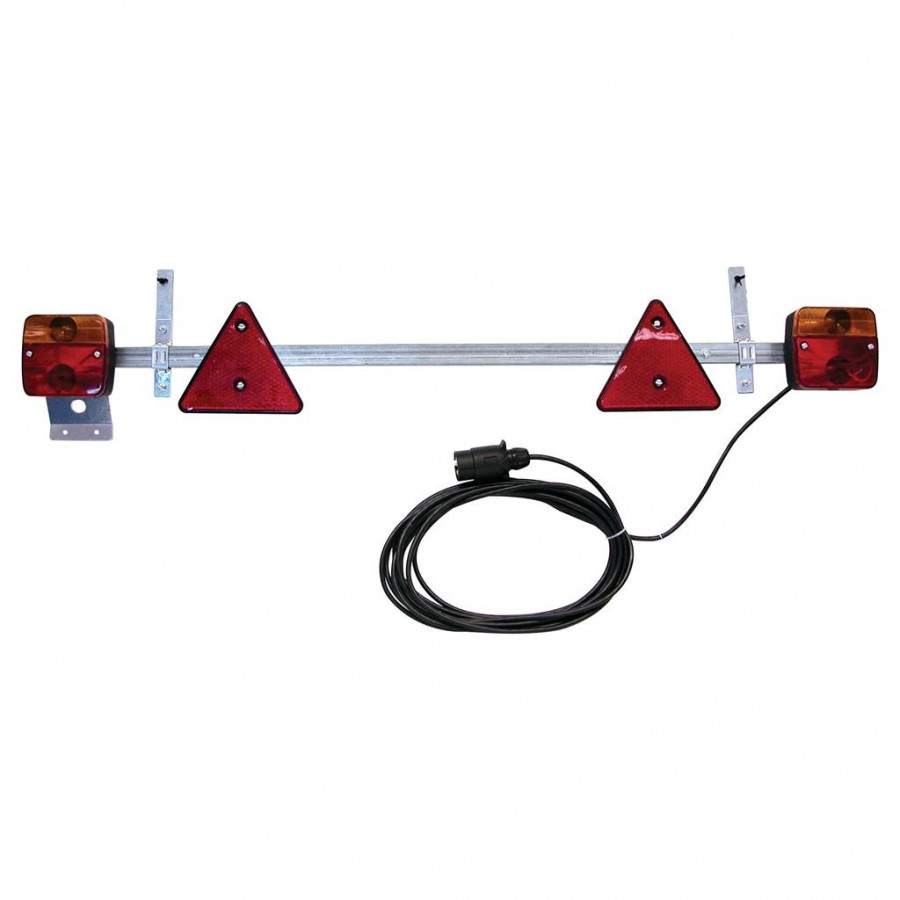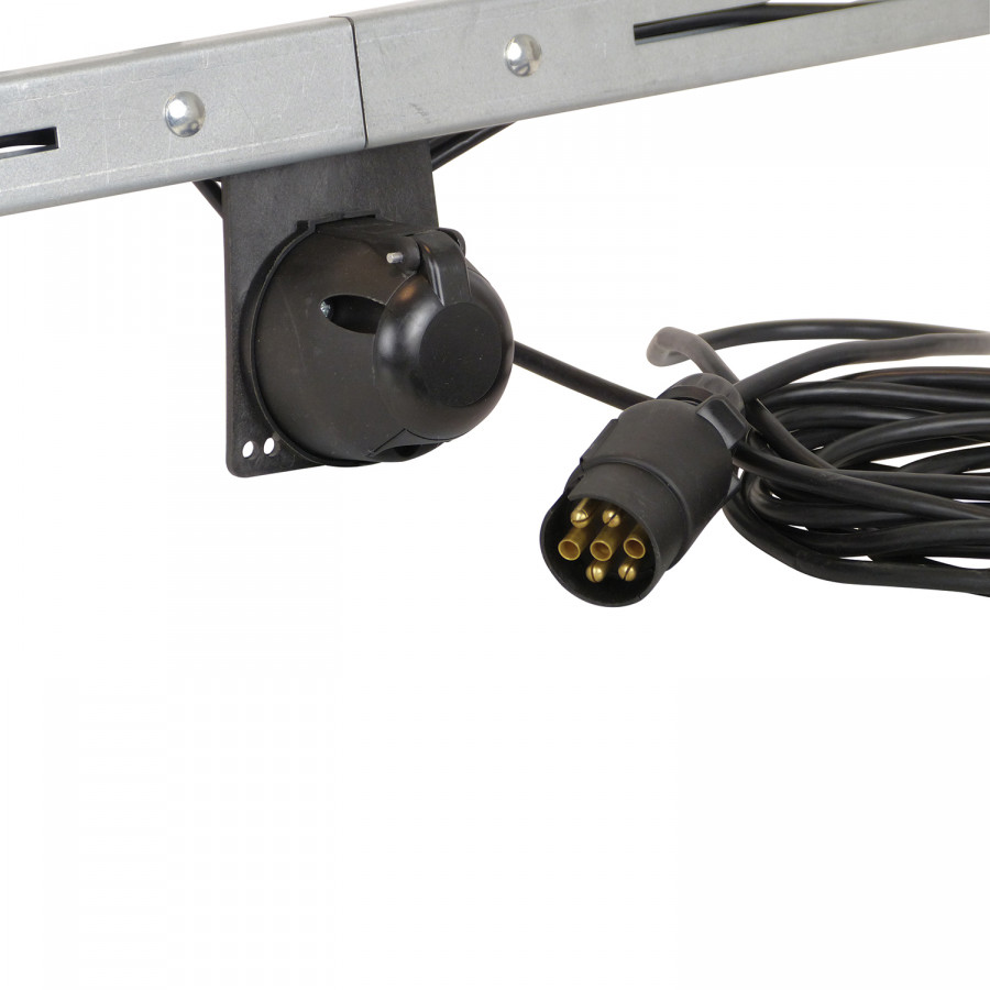 Luces de freno, luces traseras, intermitentes y catadióptricos triangulares. Con conector de 7 pines. Cable de 7,5 metros. Extensible de 140 a 210 cm. Metálico.