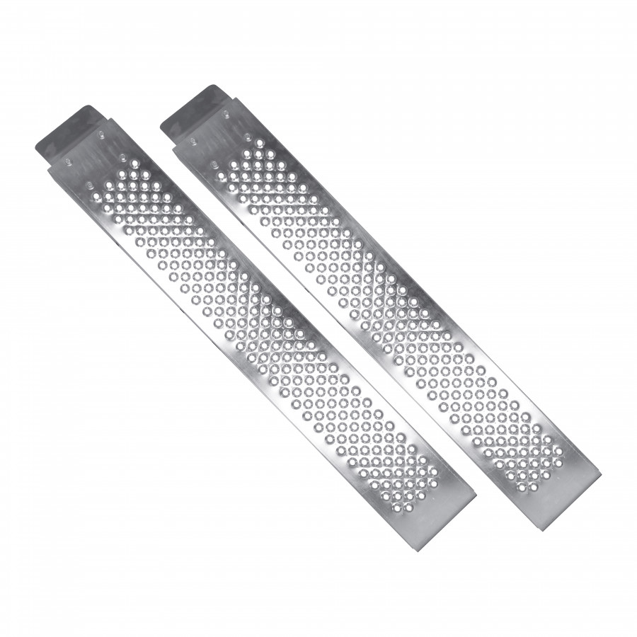 Juego de rampas de acero. Dimensiones: 150 x 22 x 4,5 cm. Capacidad: 225 kg cada una / 450 kg por juego. Superficie antideslizante.