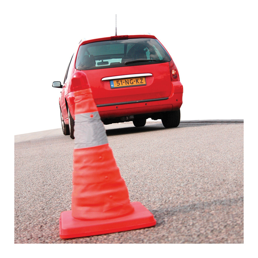 Este llamativo cono de seguridad plegable de Carpoint es ideal para cuando te quedas varado en la carretera. Al plegarse, se puede guardar de forma segura en la bolsa de transporte incluida. Una luz LED intermitente en la parte superior lo hace muy visible.