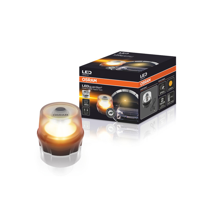 La señal luminosa OSRAM LEDguardian ROAD FLARE TA20 está homologada según el artículo 53(a) de la Ley de Licencias de Tráfico (StVZO) y, por lo tanto, puede utilizarse como complemento de un triángulo de advertencia en caso de avería de un vehículo en el tráfico rodado alemán. La luz de advertencia naranja de 360 grados de la señal luminosa OSRAM LEDguardian ROAD FLARE TA20 es visible a gran distancia y puede proporcionar información crucial sobre una situación peligrosa en el tráfico rodado en caso de emergencia.