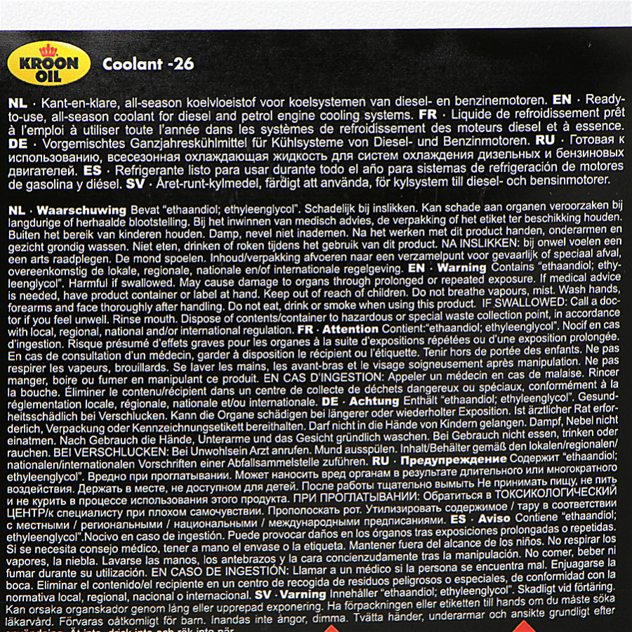 El refrigerante -26 se puede usar durante todo el año en los sistemas de refrigeración de motores de gasolina y diésel. Debe usarse sin diluir y ofrece protección hasta -26 °C.Indicaciones de peligro (CLP):