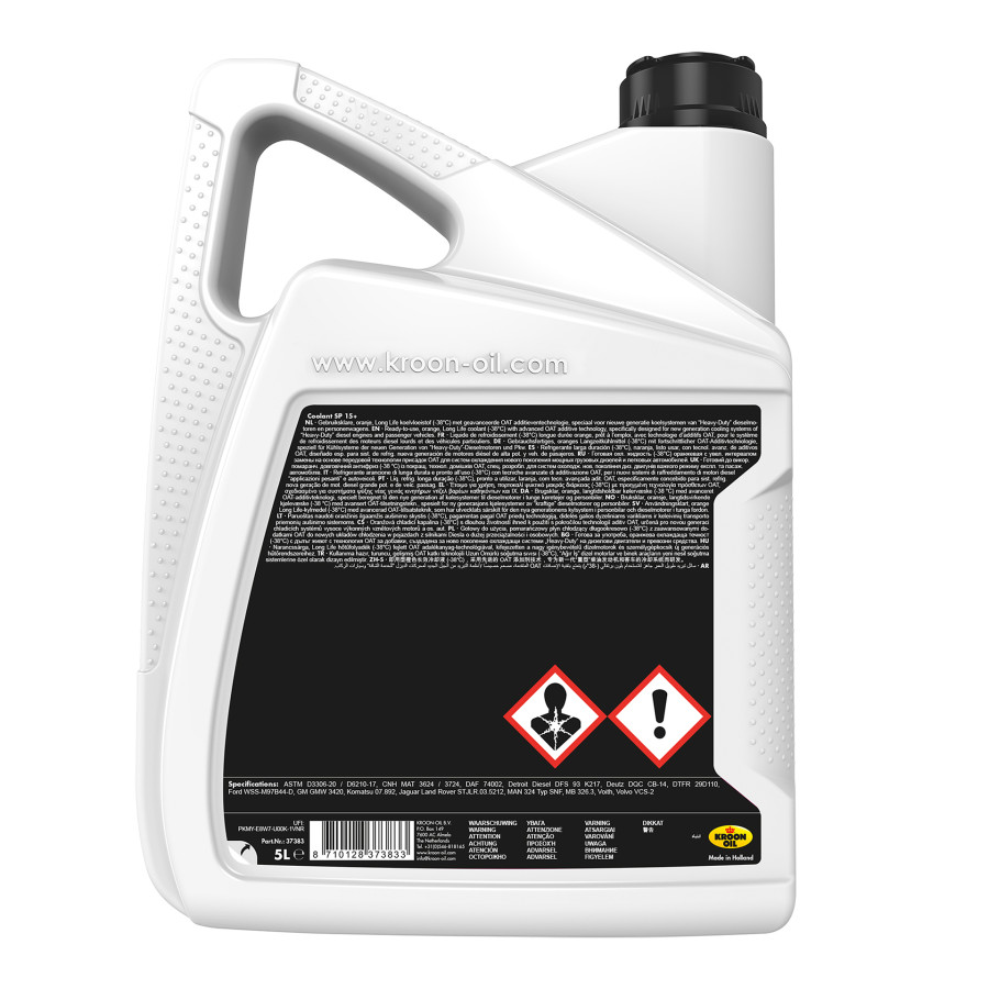 El refrigerante SP 15+ es un refrigerante premium de larga duración, listo para usar, con protección contra heladas hasta -38 °C. Su avanzada tecnología de aditivos OAT garantiza una excelente y duradera protección contra la corrosión, así como una estabilidad a largo plazo. Este producto tiene una alta capacidad neutralizadora de ácidos, lo que permite intervalos de cambio muy largos. Sus aditivos exclusivos también neutralizan los efectos negativos de los residuos de fundente que se forman durante el proceso de fabricación de radiadores de aluminio. El refrigerante SP 15+ está completamente libre de nitritos, boratos y ácido 2-etilhexanoico (2-EHA).