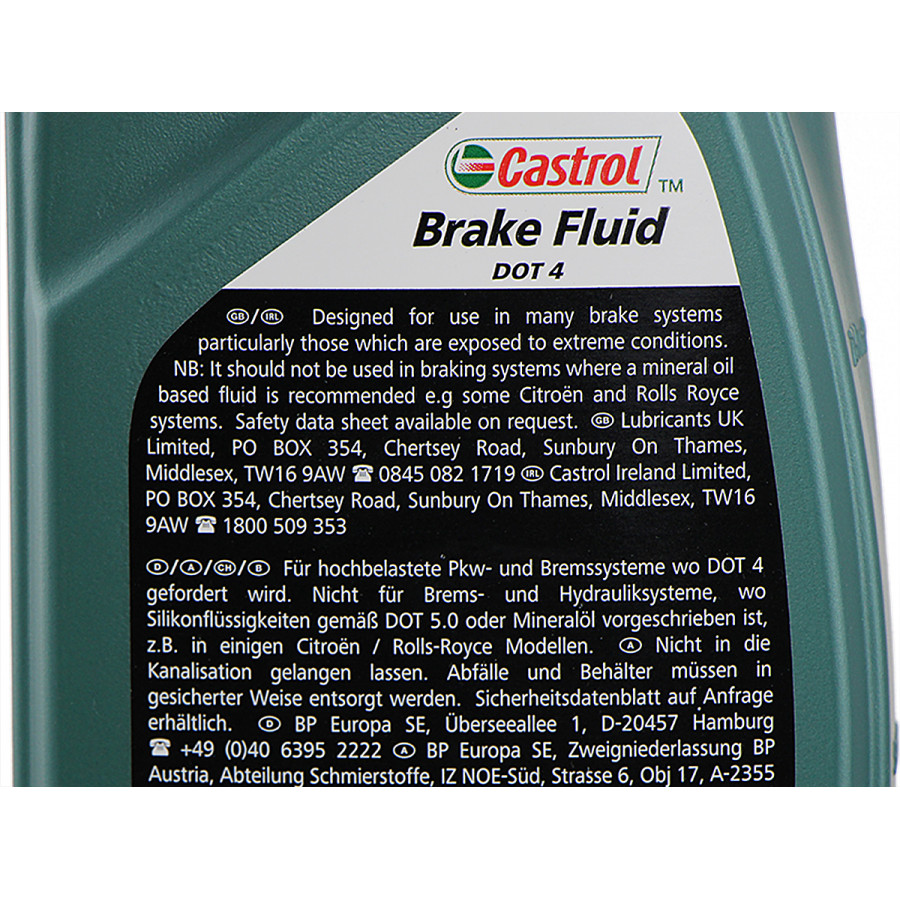 El líquido de frenos Castrol DOT4 está diseñado para su uso en todos los sistemas de frenos sometidos a condiciones extremas. Es un líquido de frenos sintético con un alto punto de ebullición que supera los requisitos de las especificaciones SAE J1703, SAE J1704, FMVSS 116 DOT 4, ISO 4925 y JIS K 2233.