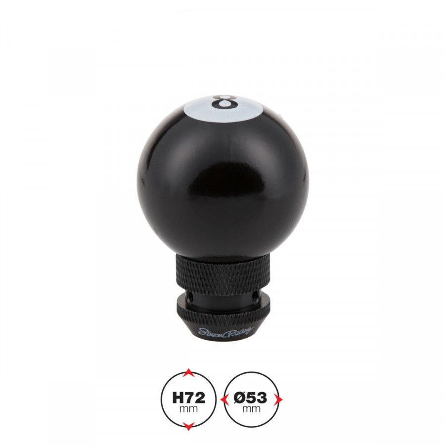 Inspirada en el clásico diseño de la "Bola 8", popular en muchas escenas de culto de coches modificados, la perilla de cambio de marchas con forma de bola de billar de Simoni Racing es universal, sin necesidad de levantarla hacia atrás. Presenta una inserción blanca con un 8 negro y un adaptador de rosca anodizado con trama cruzada para mayor durabilidad y un mayor detalle.