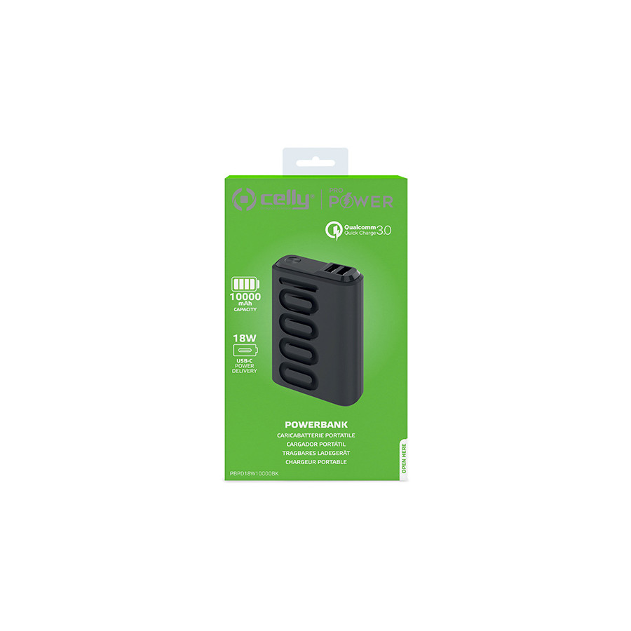 El Celly PD18W es un banco de energía con una capacidad de 10,000 mAh, capaz de cargar tu dispositivo hasta 10 veces. Cuenta con dos puertos de salida USB, un puerto de carga Micro USB y un puerto de entrada/salida USB-C. Gracias a la tecnología Power Delivery, puedes cargar smartphones y tablets en menos de una hora a través del puerto USB Tipo-C dedicado (hasta 18 vatios de potencia). Para aprovechar al máximo la tecnología Power Delivery, usa el cargador con el cable USB-C de la línea ProPower. Carga dos dispositivos simultáneamente a máxima velocidad a través de los puertos USB Quick Charge 3.0 (hasta 18 vatios de potencia).
