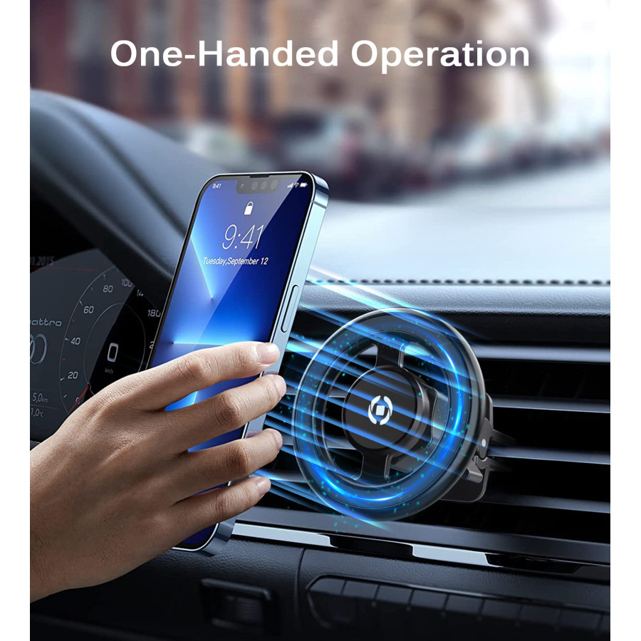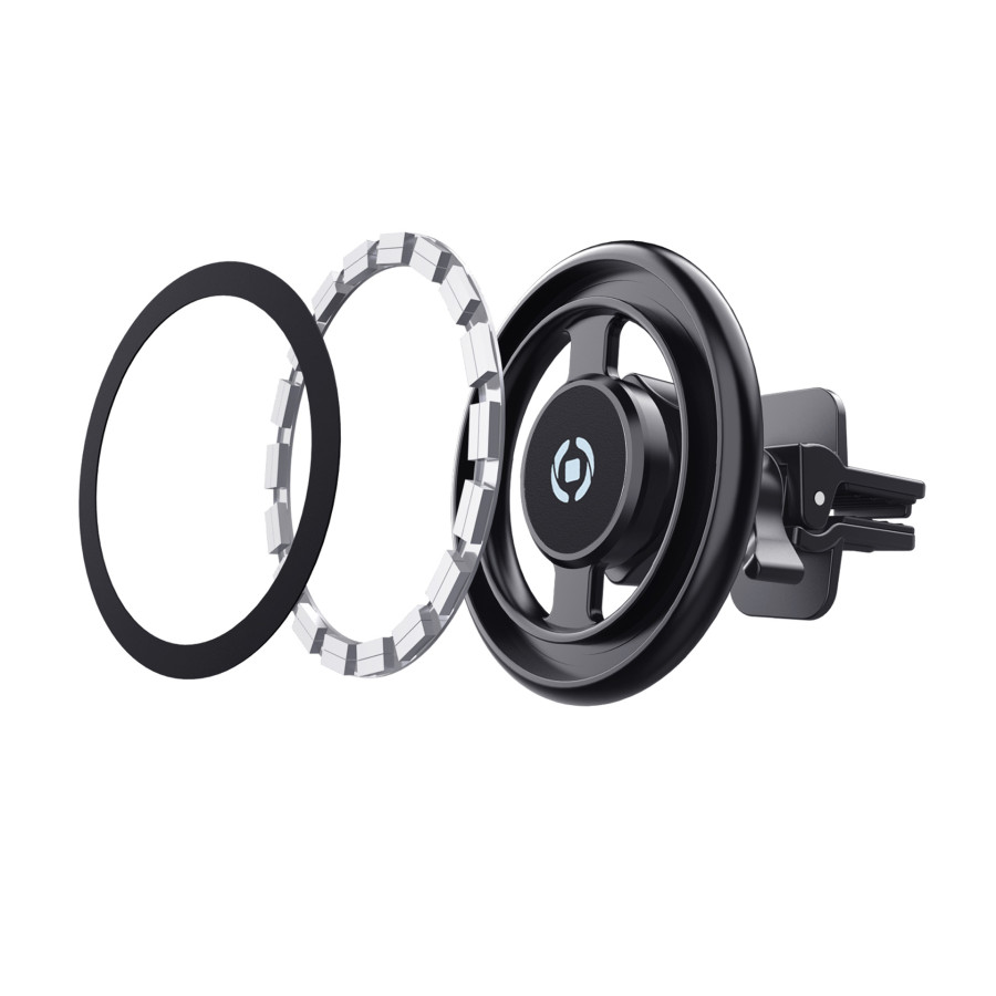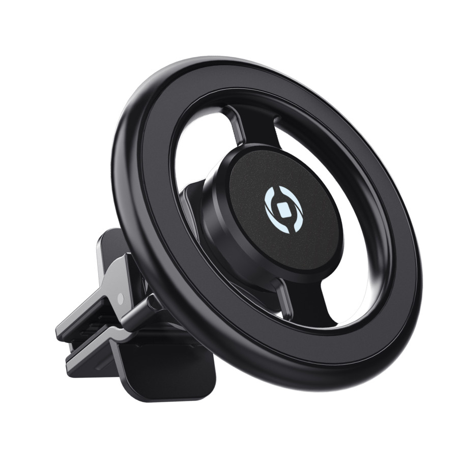 El Celly Ghostmagpro es un soporte magnético de aluminio para teléfono compatible con la línea magnética MagSafe de los últimos modelos de iPhone, a partir del modelo 12. Su diseño actualizado con estructura de aluminio proporciona mayor estabilidad y agarre. Al colocar el iPhone en el soporte, el imán redondo se adhiere automáticamente al módulo magnético del dispositivo y lo fija firmemente en su lugar. El clip ajustable y ultrafino con sistema anticaídas permite fijar el Ghostmagpro de forma segura a la rejilla de ventilación del coche. El soporte es apto para la mayoría de las rejillas de ventilación.