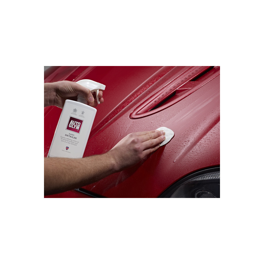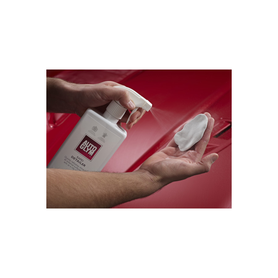 Utilizado en los eventos automotrices más exclusivos del mundo para eliminar rápidamente la contaminación ligera y las huellas dactilares. Rapid Detailer elimina la contaminación ligera, restaura el brillo y deja una capa protectora de polímero en las superficies. Es un producto de mantenimiento superior para todo tipo de superficies exteriores, incluyendo pintura, caucho, plástico, cromo, fibra de carbono y vidrio. También se puede usar como lubricante junto con una barra de arcilla.