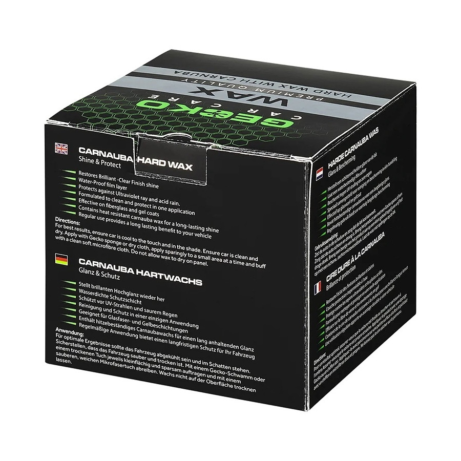 La cera dura Gecko devuelve a su pintura un brillo radiante. Deja una película repelente al agua que permite que la suciedad y el agua se deslicen fácilmente. Ofrece protección duradera contra los rayos UV, la lluvia y la suciedad.