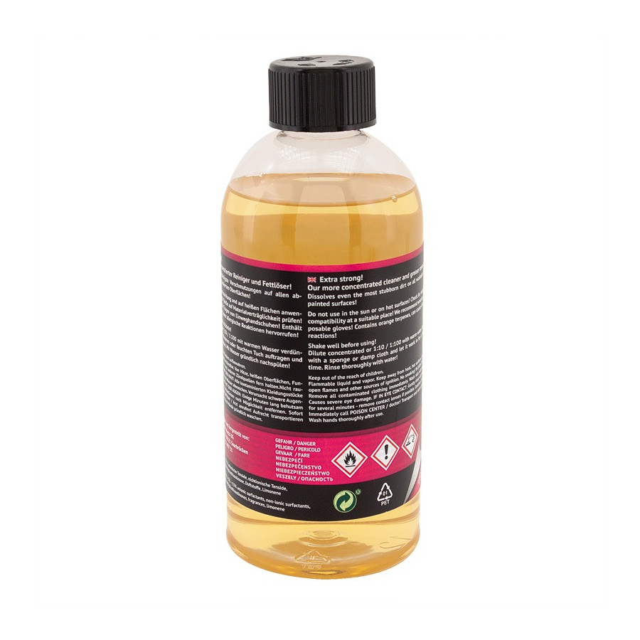 ¡Extra fuerte! ¡El limpiador y desengrasante excepcional! Disuelve incluso la suciedad más incrustada y pegajosa en todas las superficies lavables y pintadas que los champús y otros limpiadores no pueden eliminar: grasa, mugre y depósitos de aceite, residuos de alquitrán y pintura, manchas de plantas resinosas, excrementos de pájaros, residuos de cera y adhesivos, ¡y mucho más!