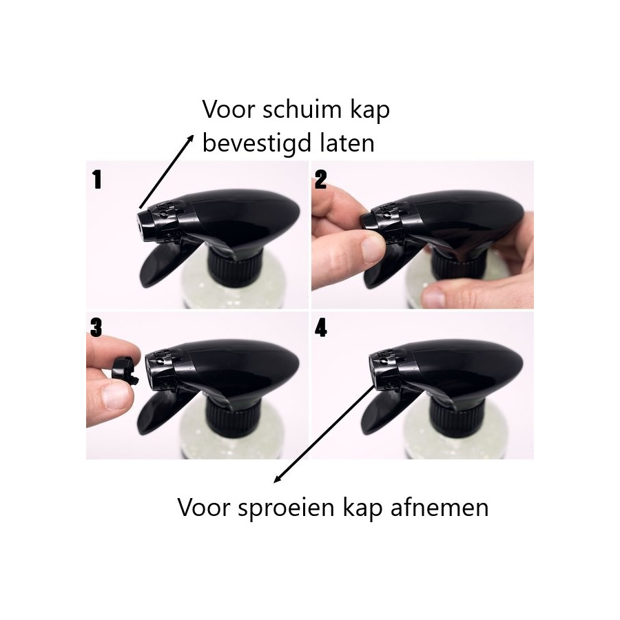 Presione los lados izquierdo y derecho juntos y gire en sentido horario hasta que se oiga un clic. Retire la boquilla para un rociado fino. Déjela puesta para una espuma espesa.