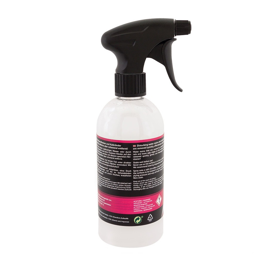 ¡Las manchas de agua y la cal se eliminan de forma rápida, sencilla y delicada! Las manchas causadas por agua dura o lluvia ácida, que dejan marcas antiestéticas en las superficies al secarse, se eliminan de forma rápida, suave y completa con este limpiador especial.