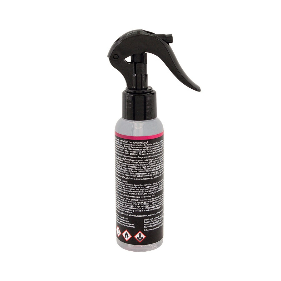 ¡El nuevo sellador en aerosol Racoon de alto brillo! ¡Fácil y rápido de usar! Nuestro nuevo nanosellador crea una capa protectora transparente y ultrafina que revitaliza el color y el brillo, proporcionando a la superficie un efecto protector e hidrófugo de larga duración. Esto reduce la recontaminación y permite una limpieza más suave y rápida del vehículo.