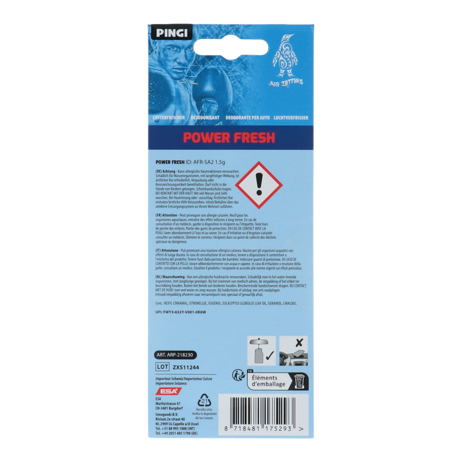 Ambientador para coche Pingi Air Tattoos Power Fresh. Refresca tu coche con este ambientador y vive la pasión y la inspiración en cada producto Pingi Air Tattoos. Combina un delicioso aroma Power Fresh con un diseño de tatuaje único.