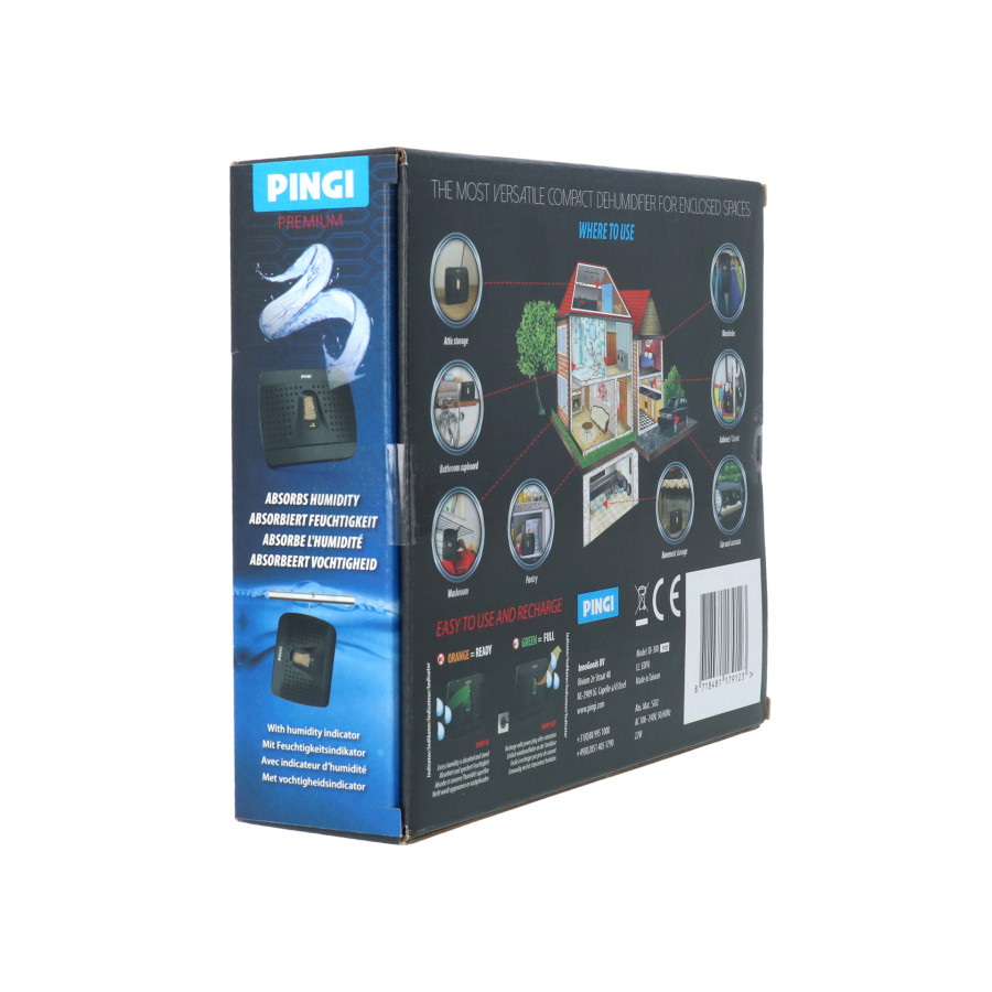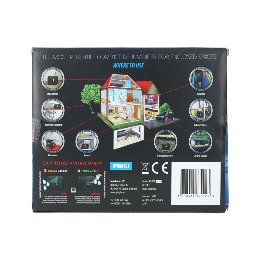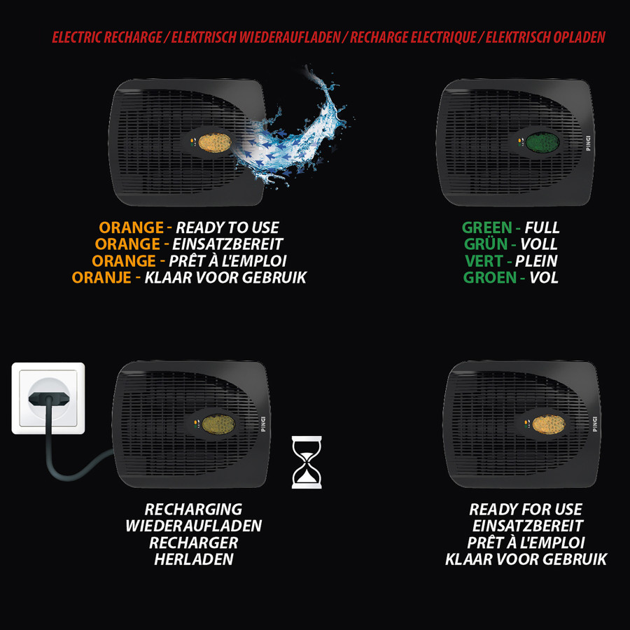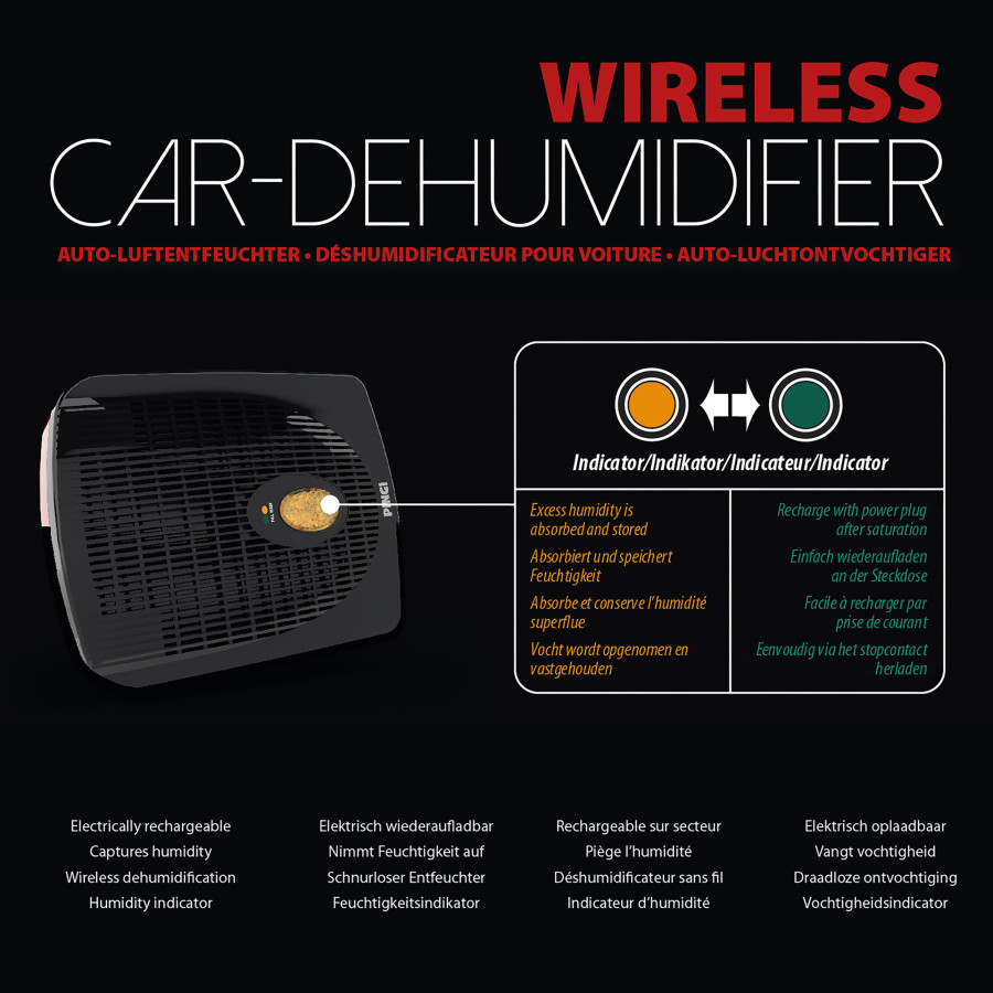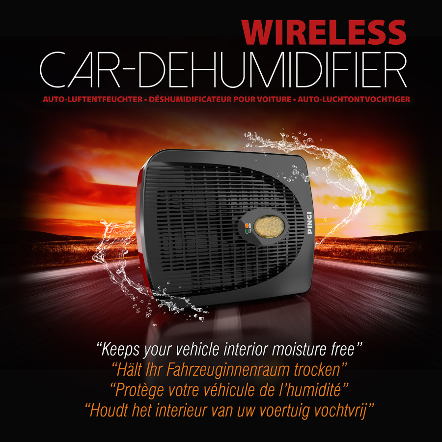 Con el Pingi ID-A300, puede controlar la humedad de sus vehículos eléctricamente. El ID-A300 es un deshumidificador eléctrico recargable para coches, furgonetas, autocaravanas o cualquier otro vehículo. Este deshumidificador combina movilidad y potencia para solucionar sus problemas de humedad. No requiere alimentación externa ni cables durante la deshumidificación.
