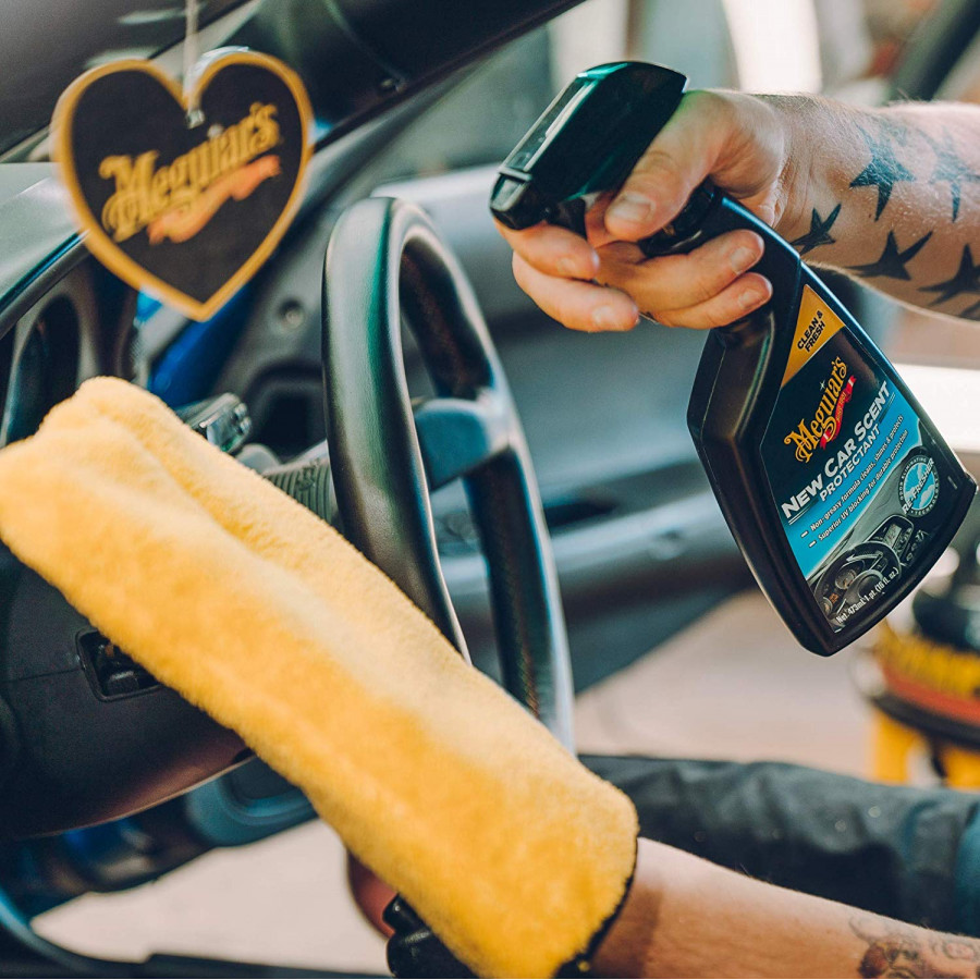 El Protector de Aroma para Auto Nuevo Meguiar's® cuenta con una fórmula versátil que limpia y protege, dejando un brillo satinado y un refrescante aroma a auto nuevo. Elimina los olores indeseados del interior. Elimina la suciedad diaria y crea un brillo satinado intenso y oscuro en superficies de vinilo, goma y plástico. Sus potentes bloqueadores UV protegen el interior y lo dejan como nuevo. Con esta fórmula premium, Meguiar's garantiza que el interior luzca y huela como nuevo.