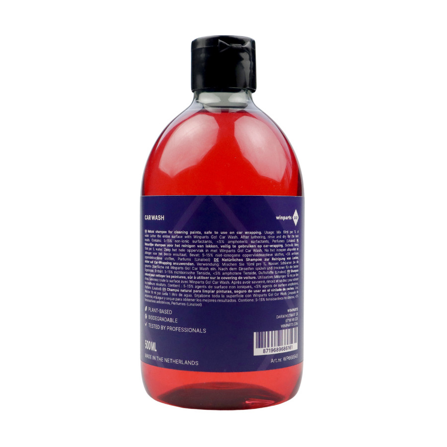 El champú para autos Winparts GO! tiene una fórmula vegetal que no solo es suave con la piel y los materiales, sino que además no contiene ingredientes dañinos. Con este champú, puede dejar su auto reluciente sin dañar el medio ambiente. Elimina fácilmente la grasa y la suciedad para un resultado impecable.