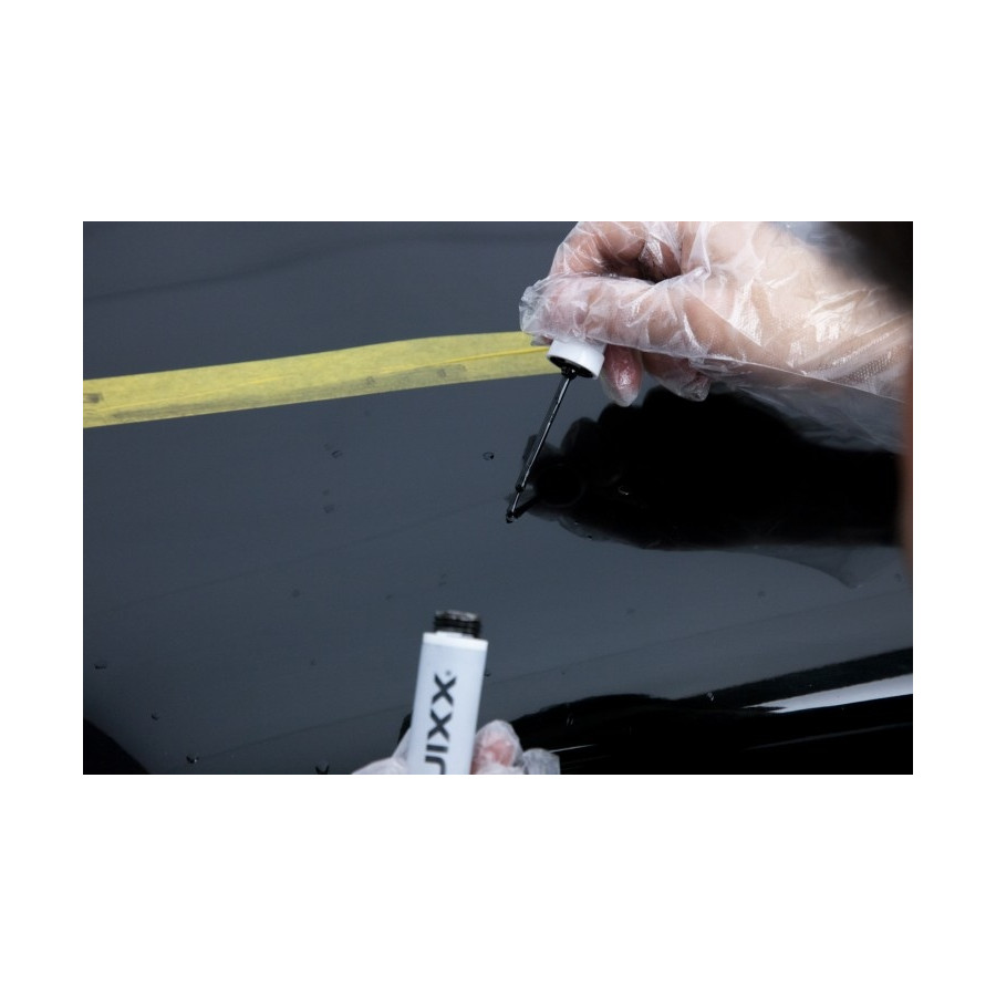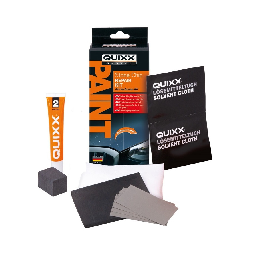 Repintar un capó completo es costoso y requiere mucho tiempo. Gracias al Kit de Reparación de Impactos de Piedra QUIXX, los antiestéticos impactos y astillas en la pintura frontal de su auto desaparecerán en un instante. Este producto ayuda a evitar costosas reparaciones en talleres de chapa y pintura y contribuye a la conservación del valor con una sencilla solución casera.
