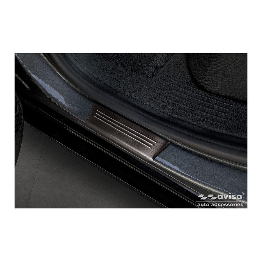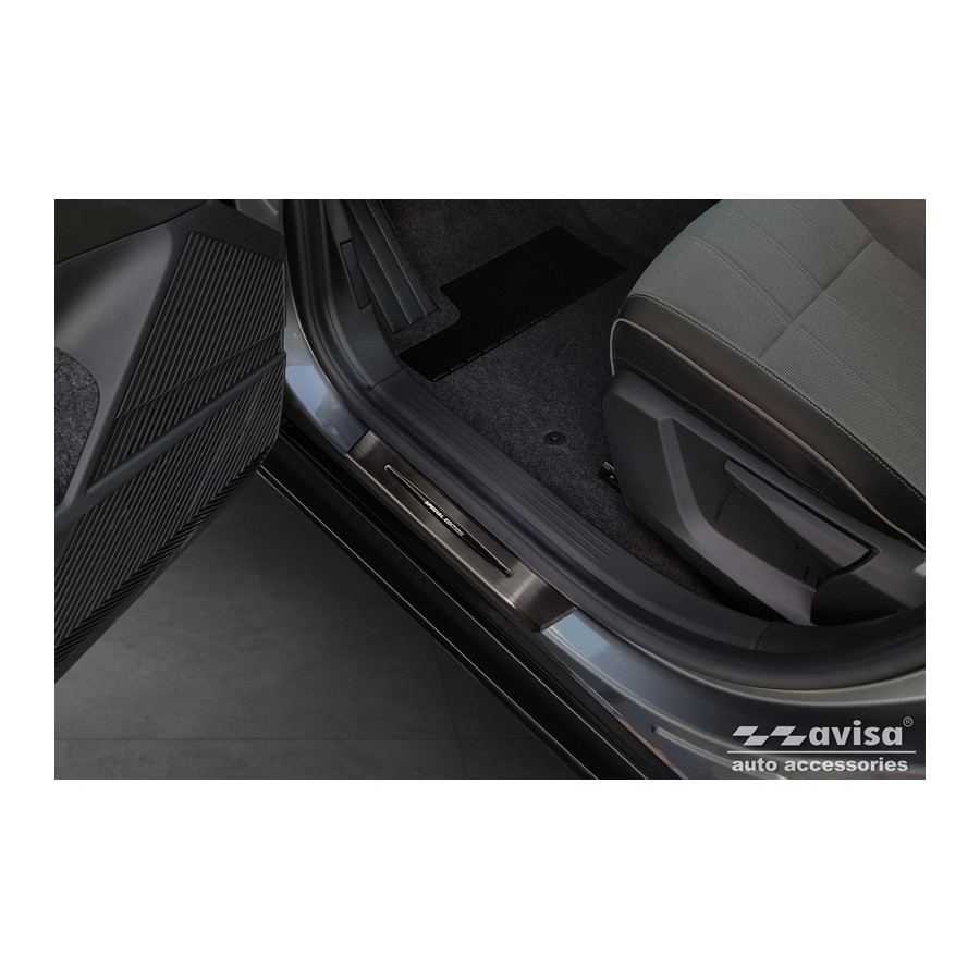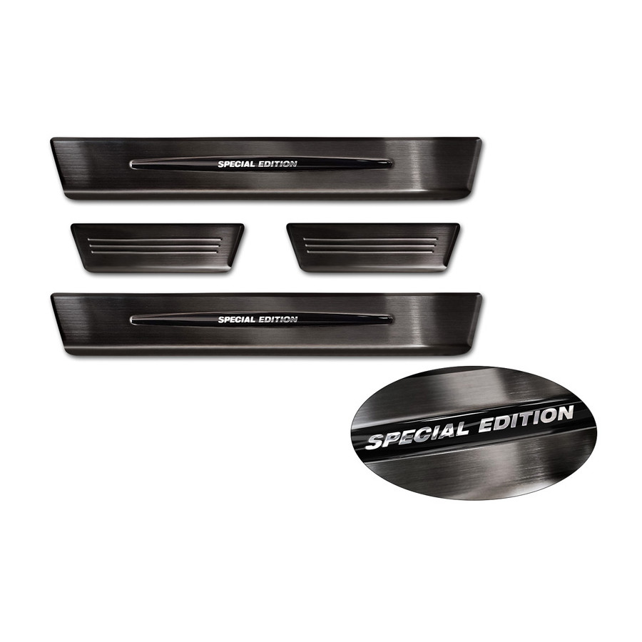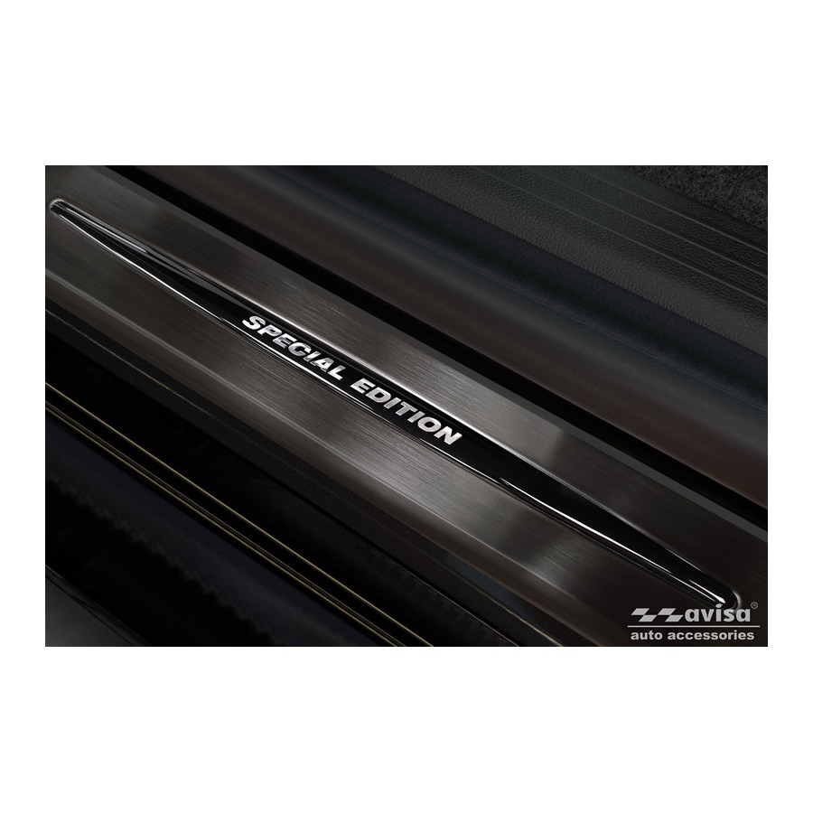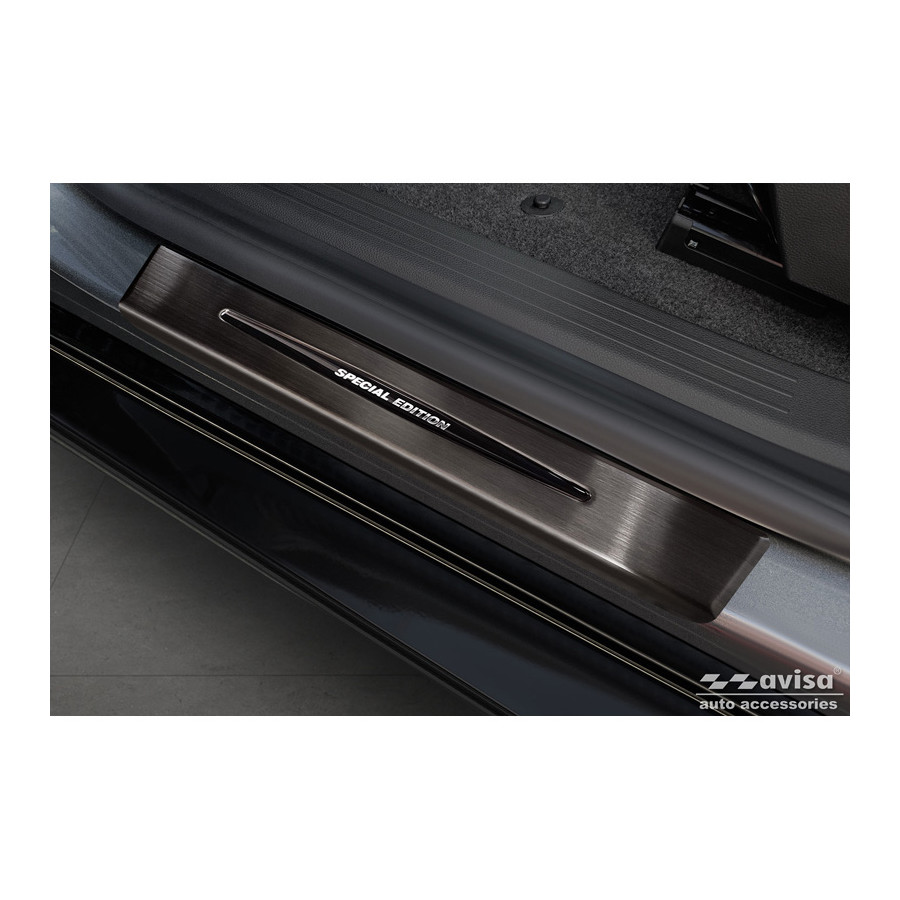Embellecedores de umbral de puerta de acero inoxidable negros, aptos para Renault Megane E-Tech 2022- - 'Edición Especial' - Juego de 4. Los embellecedores de umbral de puerta son el accesorio definitivo para proteger los umbrales de su coche y darles un aspecto lujoso. Están hechos a medida para su vehículo, garantizando un ajuste perfecto. Evitan arañazos y daños al entrar y salir, y protegen de las inclemencias del tiempo. Con una amplia gama de materiales y diseños, puede darle a su coche un aspecto único. Estos embellecedores de umbral de puerta son fáciles de colocar con la cinta 3M incluida. Especificaciones: Líneas troqueladas y logotipo 'Edición Especial' cromado. Contenido: Juego de 4 para puertas delanteras y traseras. Color: Negro. Material: Acero inoxidable.