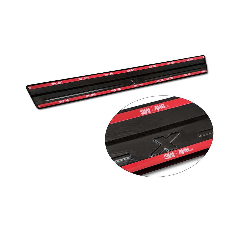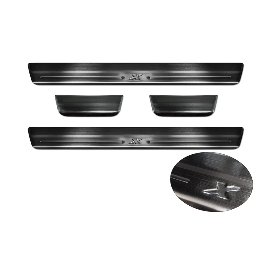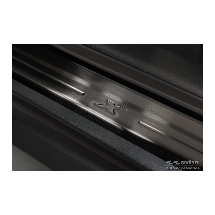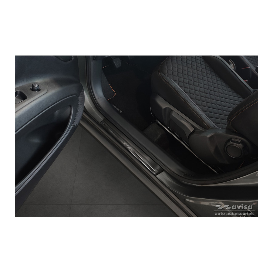 Molduras de umbral de puerta de acero inoxidable negro para Toyota Aygo X 2022 - 'Líneas X' - Juego de 4. Las molduras de umbral de puerta son el accesorio definitivo para proteger los umbrales de su coche y darle un aspecto lujoso. Están hechas a medida para su tipo de coche, lo que garantiza un ajuste perfecto. Evitan arañazos y daños al entrar y salir, y protegen de las inclemencias del tiempo. Con una amplia selección de materiales y diseños, puede darle a su coche un aspecto único. Estas molduras de umbral de puerta son fáciles de colocar con la cinta 3M incluida. Especificaciones: Información adicional: Líneas troqueladas. Contenido: Juego de 4 piezas para puertas delanteras y traseras. Color: Negro. Material: Acero inoxidable.