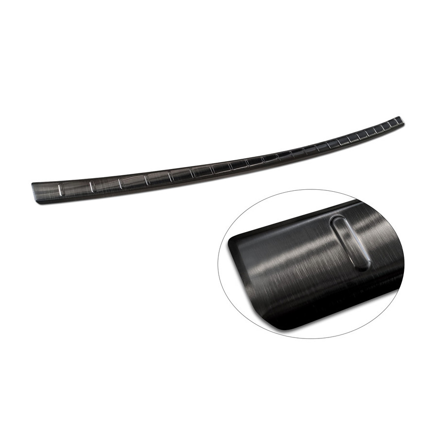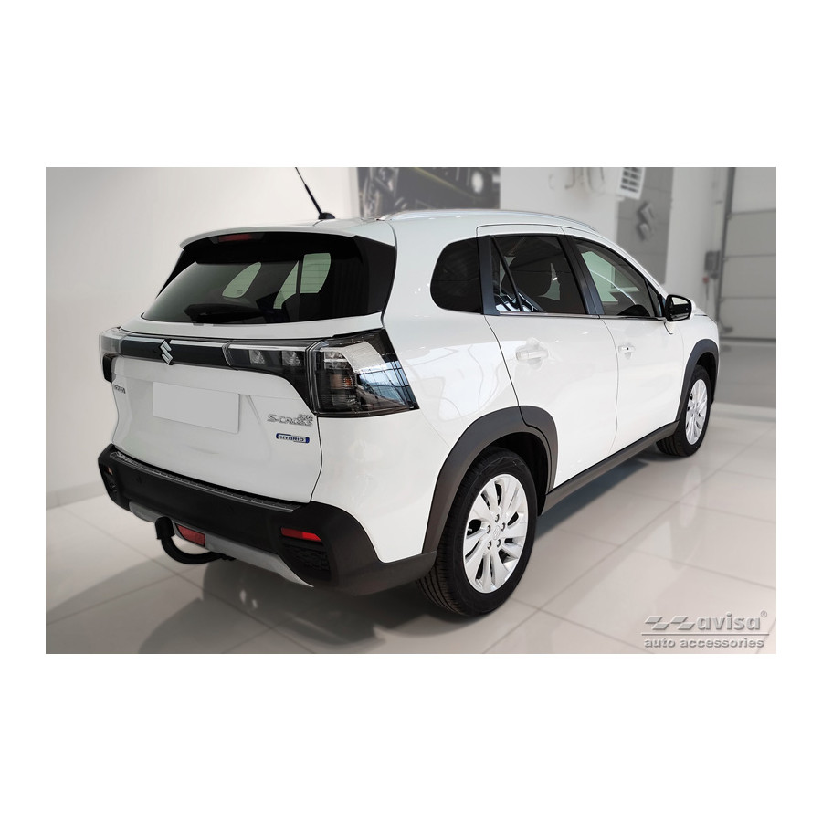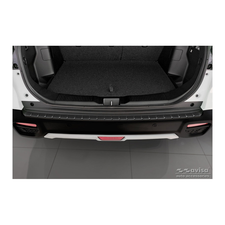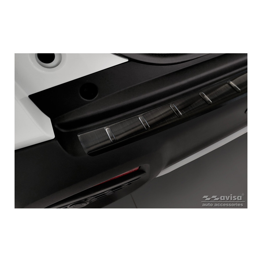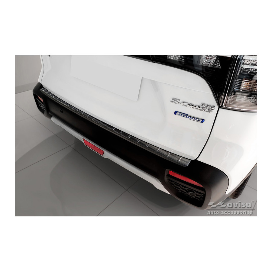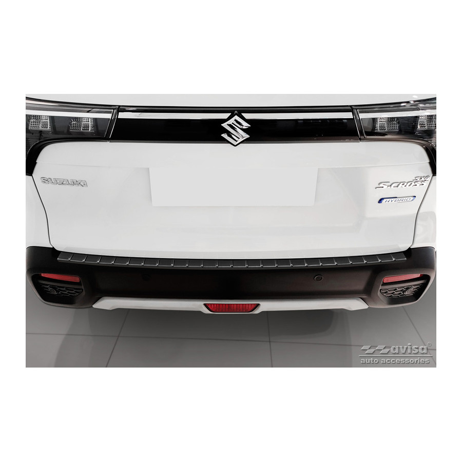 Protector de parachoques trasero de acero inoxidable negro, compatible con Suzuki S-Cross II 2022 - "Ribs". Ofrece una protección óptima contra el desgaste diario en la parte superior del parachoques trasero. Esta parte del vehículo es especialmente susceptible a daños durante la carga y descarga. Los costes de reparación y repintado son elevados, lo que puede reducir el valor del vehículo.