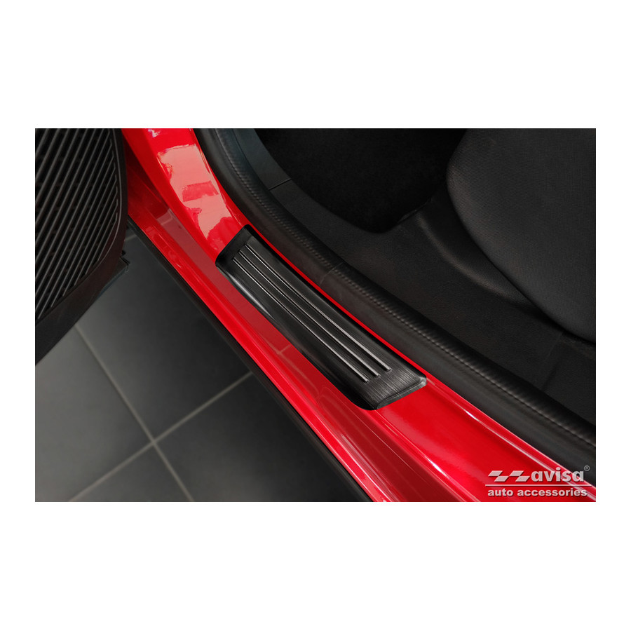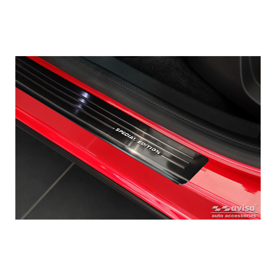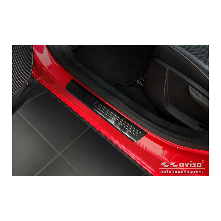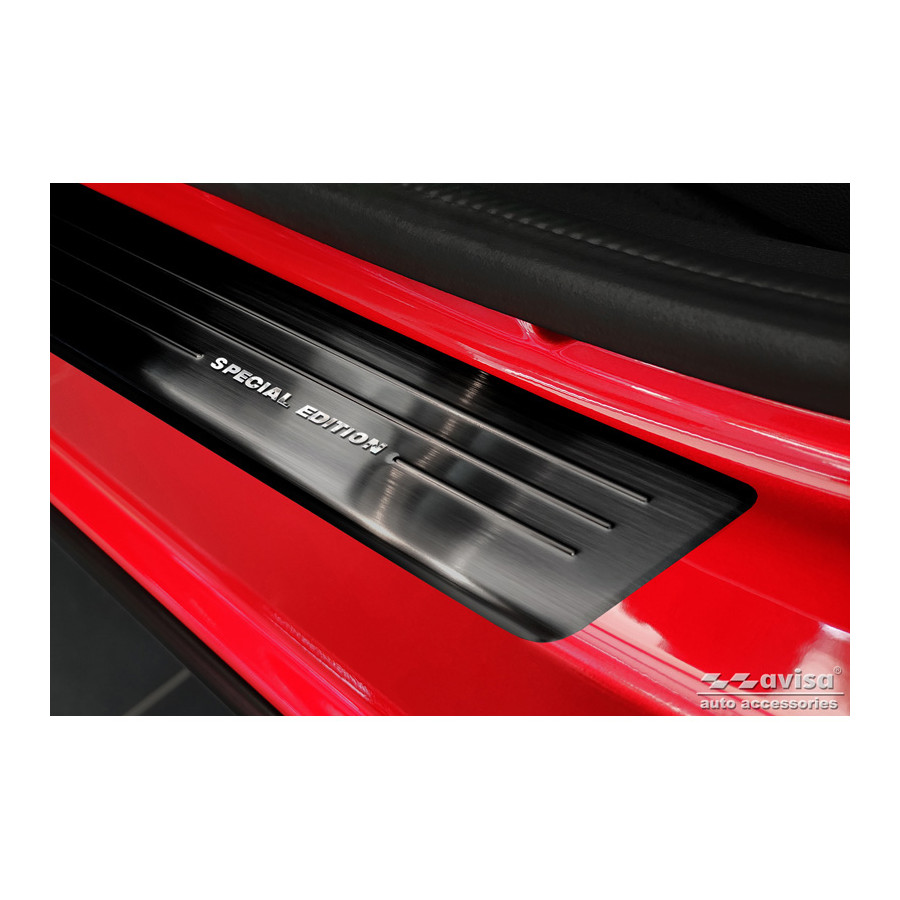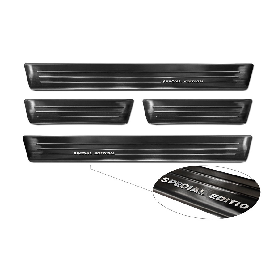 Embellecedores de umbral de puerta de acero inoxidable negros, aptos para Renault Arkana 2020- - Edición Especial - Juego de 4. Los embellecedores de umbral son el accesorio definitivo para proteger los umbrales de su coche y darle un aspecto lujoso. Están hechos a medida para su vehículo, garantizando un ajuste perfecto. Evitan arañazos y daños al entrar y salir, y protegen de las inclemencias del tiempo. Con una amplia selección de materiales y diseños, puede darle a su coche un aspecto único. Estos embellecedores de umbral son fáciles de colocar con la cinta 3M incluida. Especificaciones: Líneas troqueladas y logotipo "Edición Especial" cromado. Contenido: Juego de 4 para puertas delanteras y traseras. Color: Negro. Material: Acero inoxidable.
