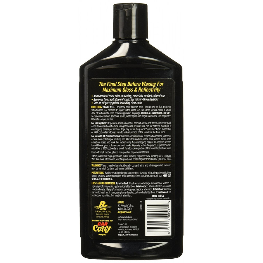 ¿Quieres encerar tu coche? Este es el último paso antes de encerarlo. Primero, usa el pulimento definitivo de Meguiar's para lograr el máximo brillo y reflejo. Este pulimento definitivo contiene aceites nutritivos que crean un aspecto más rico, profundo y húmedo en la pintura. Además, el pulimento definitivo de Meguiar's elimina las pequeñas marcas en la pintura. Después del tratamiento, no se verá ni un solo rasguño en la capa de cera. Después, comienza con un tratamiento de cera y te garantizamos que el resultado será mucho mejor de lo habitual. Este producto se puede aplicar manualmente o con una pulidora de doble acción (máquina DAP).