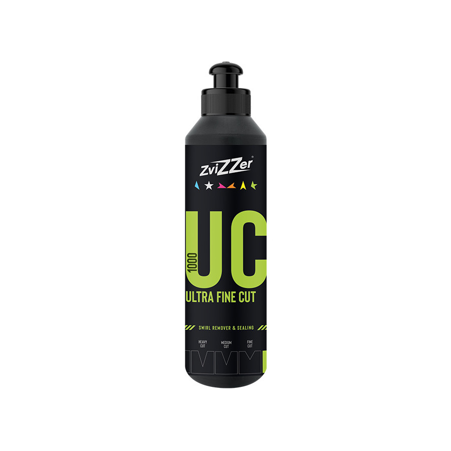 Para obtener resultados óptimos, recomendamos usar el ZviZZer UC1000 Ultra Fine Cut junto con la almohadilla verde (ultraacabado) y los paños de microfibra verdes. Esta combinación garantiza los mejores resultados al eliminar incluso los arañazos más finos y lograr un brillo excepcional.