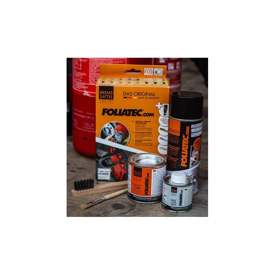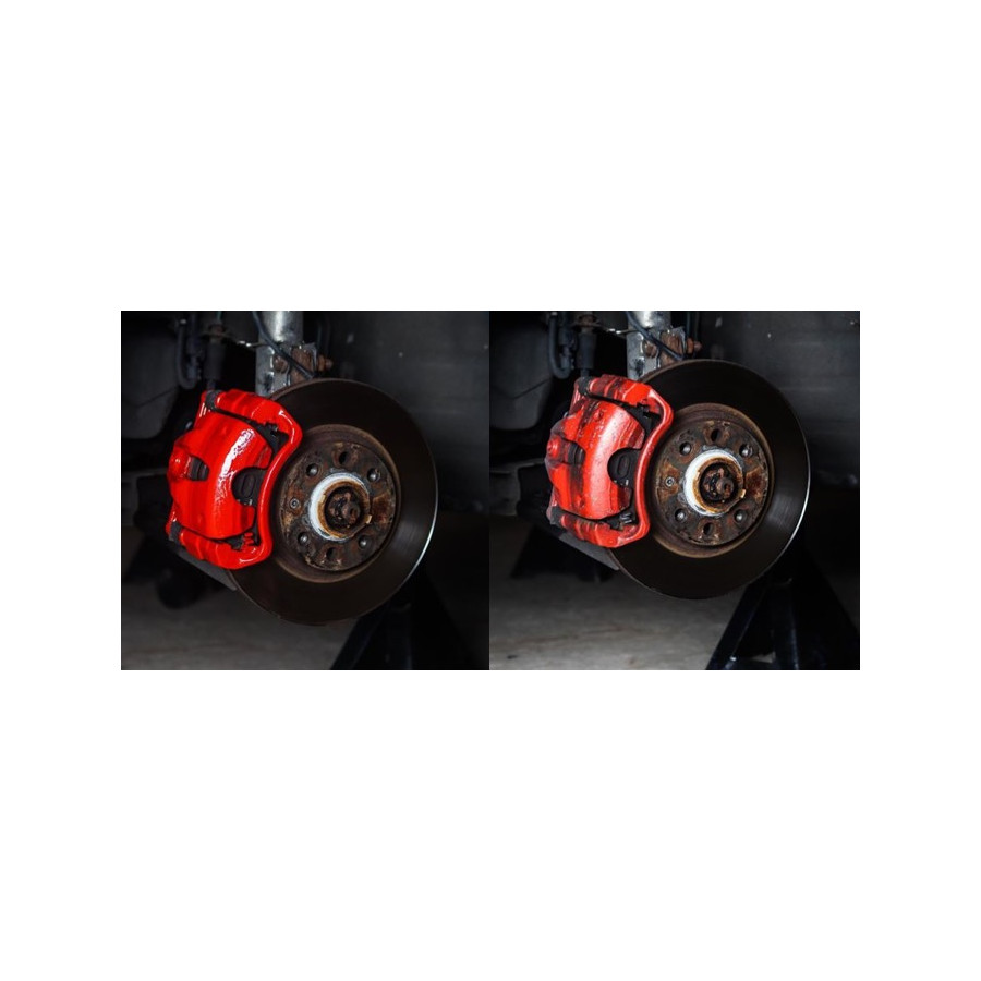 Un juego de pintura para pinzas de freno le da a tu coche un aspecto dinámico y deportivo, sellando y protegiendo la superficie durante mucho tiempo. Es una forma económica de darle a tu coche ese toque deportivo extra. El juego consta de tres partes: limpiador de pinzas de freno, pintura y endurecedor. El limpiador limpia la superficie y elimina el polvo de los frenos. Después, se puede mezclar una parte de pintura y endurecedor y aplicarla a la pinza con una brocha pequeña. Tras el curado, la pintura es resistente a temperaturas de 300 °C, a la corrosión, al aceite y a la gasolina.