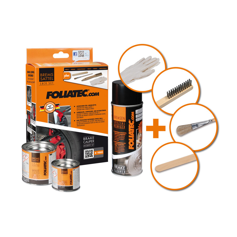 Un juego de pintura para pinzas de freno le da a tu coche un aspecto dinámico y deportivo, sellando y protegiendo la superficie durante mucho tiempo. Es una forma económica de darle a tu coche ese toque deportivo extra. El juego consta de tres partes: limpiador de pinzas de freno, pintura y endurecedor. El limpiador limpia la superficie y elimina el polvo de los frenos. Después, se puede mezclar una parte de pintura y endurecedor y aplicarla a la pinza con una brocha pequeña. Tras el curado, la pintura es resistente a temperaturas de 300 °C, a la corrosión, al aceite y a la gasolina.