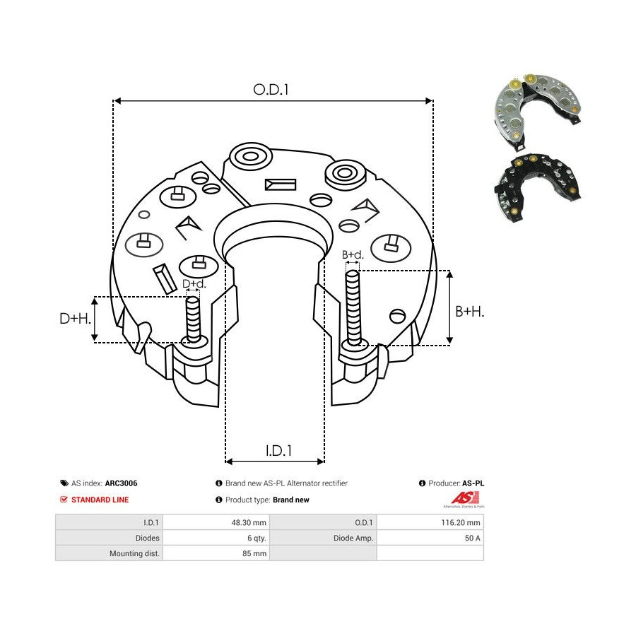 Diámetro exterior [mm] 116,20 Diámetro interior [mm] 48,30 Calidad Línea estándar Garantía 2 años Número de diodos 6 Corriente [A] 50 Pieza nueva sin deposito -