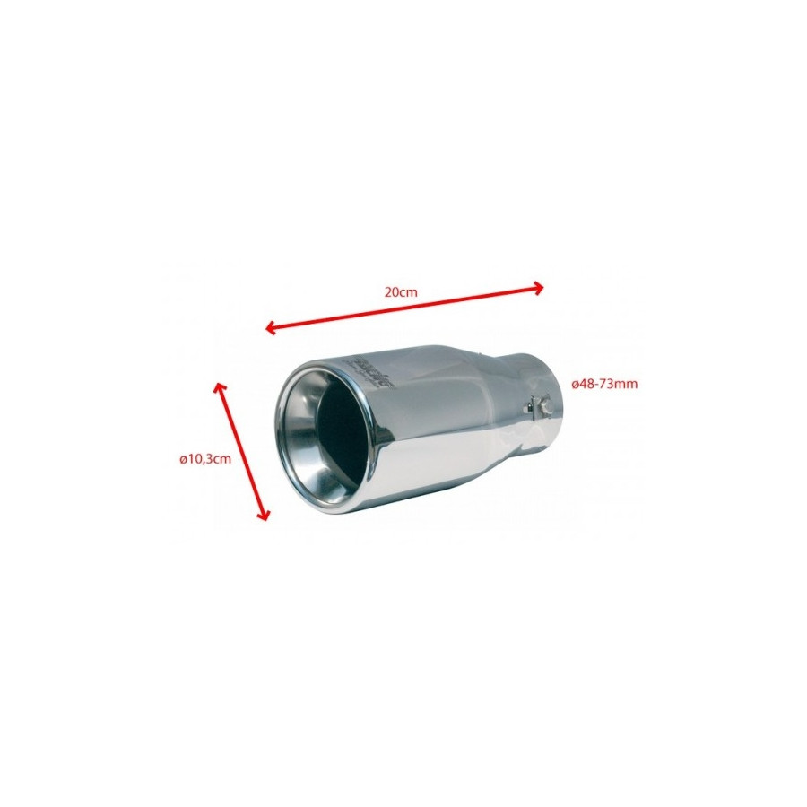 Esta cola de escape tiene un aspecto deportivo y está fabricada íntegramente en acero inoxidable. Cuenta con una enorme cola de escape de 100 mm de diámetro y una impresionante longitud de 200 mm. Se instala fácilmente en sistemas de escape con un diámetro de montaje de entre 48 y 73 mm.