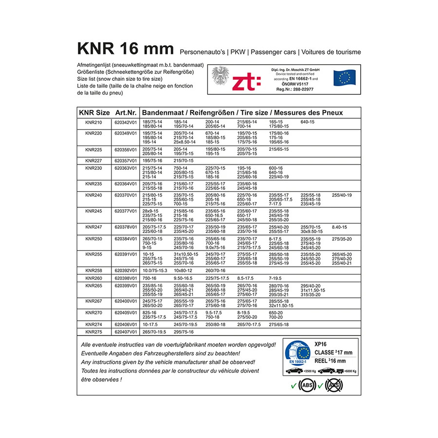 Las cadenas para nieve son fáciles de instalar. El tensor manual facilita y agiliza la instalación. Los eslabones de 16 mm de grosor garantizan una tracción óptima en carreteras con nieve y hielo.