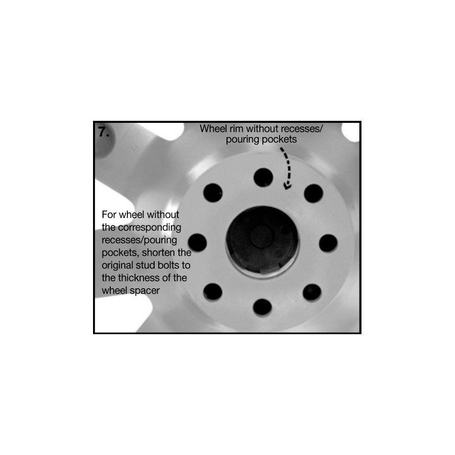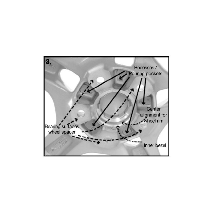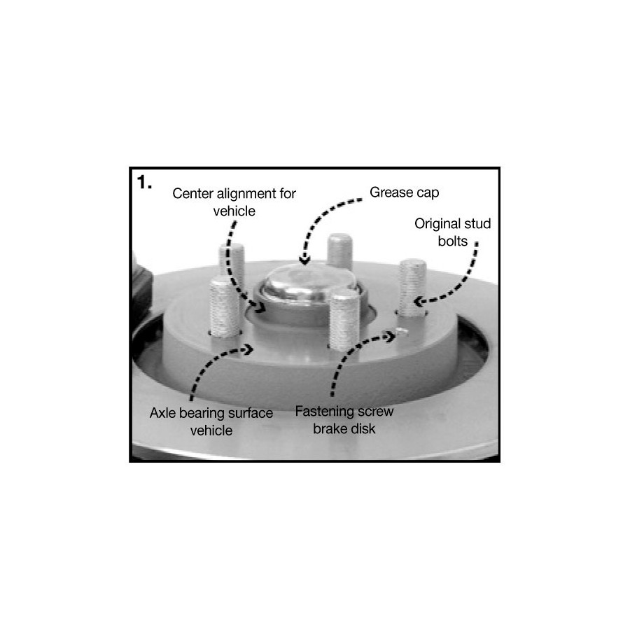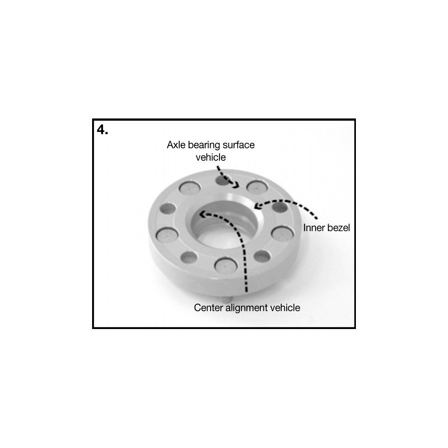 El espaciador de vía debe fijarse al buje axial con las tuercas de montaje suministradas. A continuación, las ruedas deben montarse con las tuercas originales incluidas. Generalmente, no es posible usar ruedas de acero con sistemas DRM.