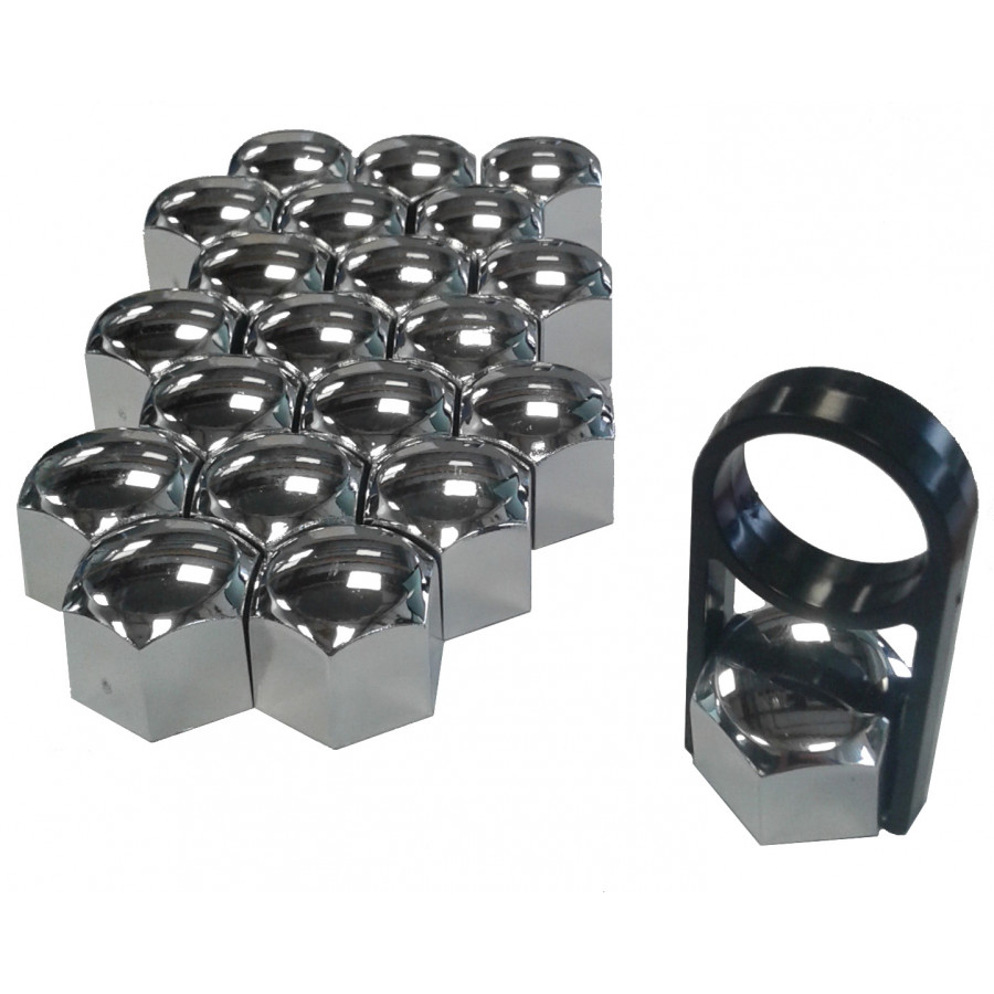 Juego de 21 tapacubos universales de plástico para tuercas de rueda. Incluye un adaptador para retirarlos.