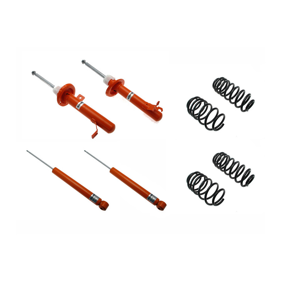 El kit KONI STR.T consta de amortiguadores KONI STR.T y muelles de bajada de altura hechos a medida por el fabricante alemán H&R. Ambas compañías cuentan con años de experiencia en las categorías más altas del automovilismo, como la Fórmula 1 y el DTM. Las ventajas para el cliente son evidentes. Esta experiencia, combinada con la tecnología más avanzada, se integra directamente en los amortiguadores y muelles. Los amortiguadores KONI STR.T ofrecen una dirección y un manejo perfectos, además de una fuerza centrífuga impresionante. Gracias a su rapidísima respuesta, el piloto puede confiar plenamente en su kit STR.T, incluso en situaciones peligrosas y exigentes. El resultado de esta colaboración entre H&R y los amortiguadores KONI STR.T es que el preparador del kit STR.T dispone de un kit perfectamente equilibrado para su coche. Esto minimiza los movimientos indeseados de la carrocería. Según el modelo, está disponible una bajada fija de hasta 40 mm.