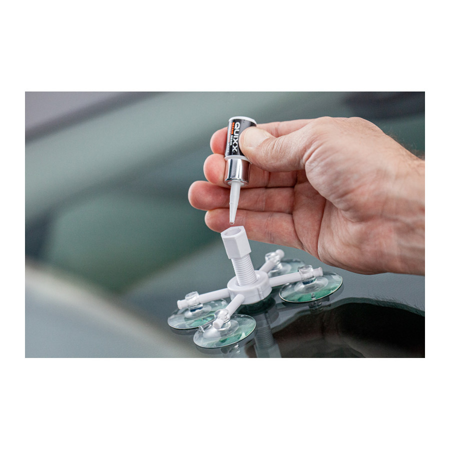 El kit de reparación de parabrisas QUIXX es la alternativa fiable y económica a los costosos reemplazos de parabrisas. Gracias a herramientas de aplicación especiales y una resina transparente de alta eficacia basada en la tecnología de vidrio líquido, la mayoría de los parabrisas desportillados se pueden reparar de forma rápida y sencilla.
