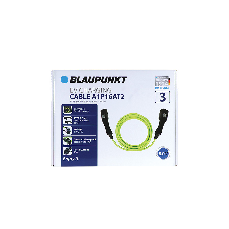 Descubre el cable de carga Blaupunkt: el accesorio perfecto para tu coche eléctrico. Diseñado según la norma IP54, podrás usarlo con seguridad y tranquilidad en exteriores, independientemente del clima. Con una longitud total de 8 metros, el cable ofrece la máxima flexibilidad para cargar tu coche.