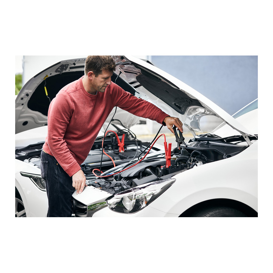 Los diferentes colores de los cables y las pinzas de sujeción reducen el riesgo de confundir los terminales positivo y negativo, lo que reduce el riesgo de conectar la batería incorrectamente. La bolsa de almacenamiento incluida permite guardar los cables de forma ordenada y compacta. Las instrucciones de uso también se encuentran en la parte posterior de la bolsa para un acceso rápido.