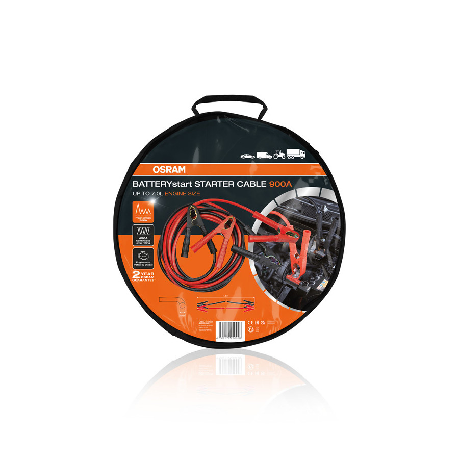 El cable de arranque OSRAM BATTERYstart 900A es de alta calidad, ideal para uso profesional y doméstico. Fabricado en aluminio revestido de cobre, reduce la resistencia del cable y permite una transferencia de corriente constante y eficaz. Tiene 4,5 metros de longitud y una sección transversal de 35 mm². Gracias a su longitud y sección, permite arrancar vehículos con motores de gasolina y diésel de hasta 7 litros, alcanzando una corriente pico de hasta 900 A y una corriente continua de 450 A. Es compatible con 12 V y 24 V.
