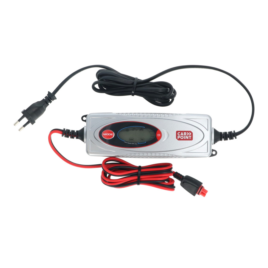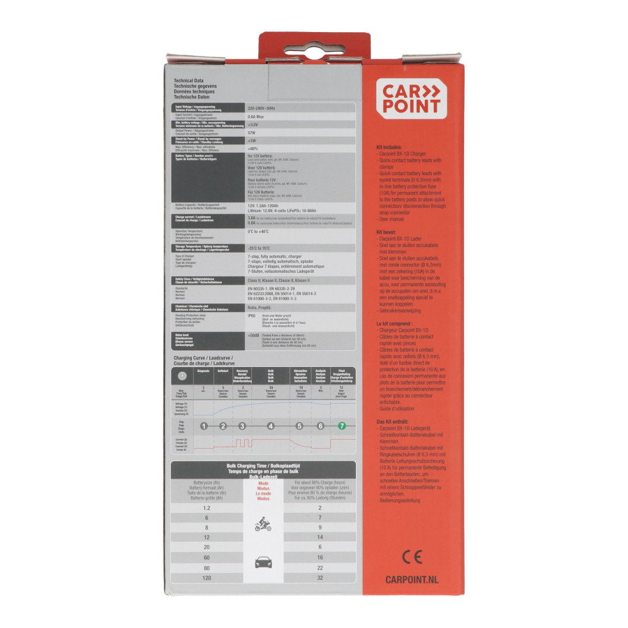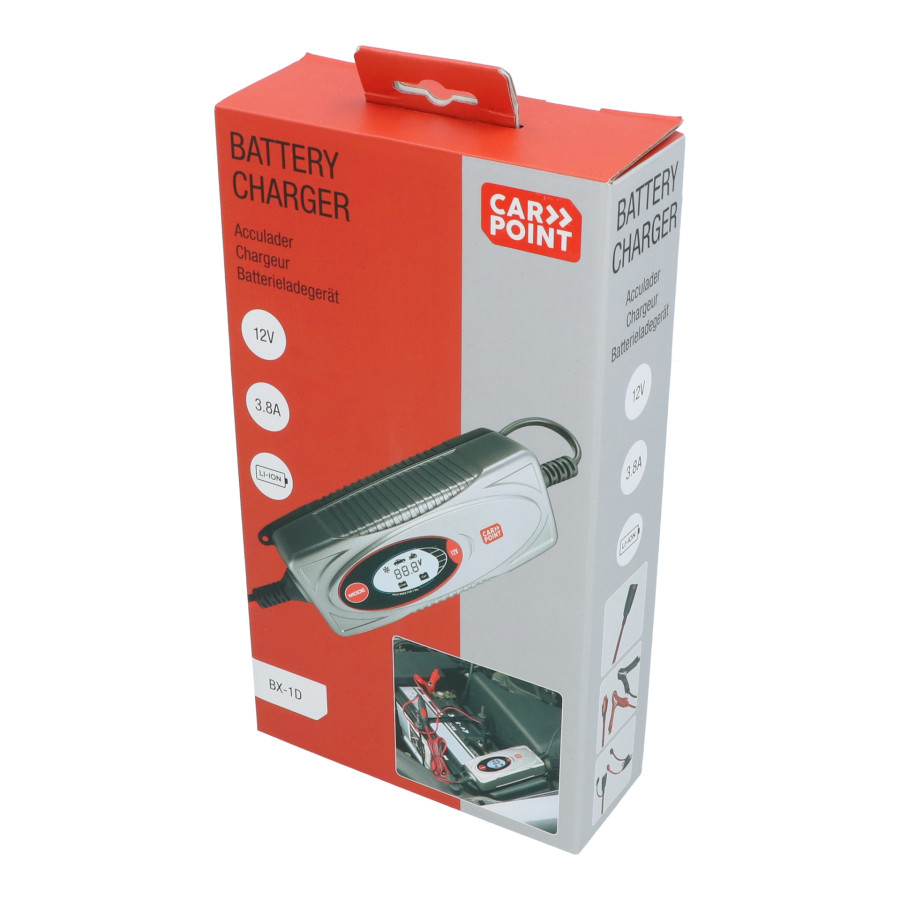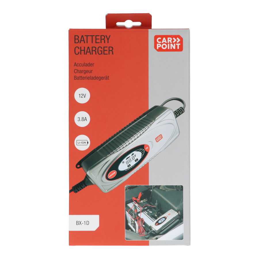 Este cargador de batería Carpoint BX-1D es adecuado para cargar baterías de plomo-ácido recargables de 12 voltios y de 1,2 a 120 amperios y baterías de litio de 10 a 80 amperios.